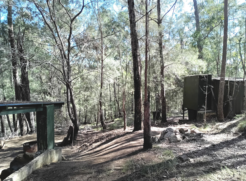 a camping/property service area in an elevated location above the river, with a solid shelter and solid concrete bench and storage, plus flat areas for parking, etc.;