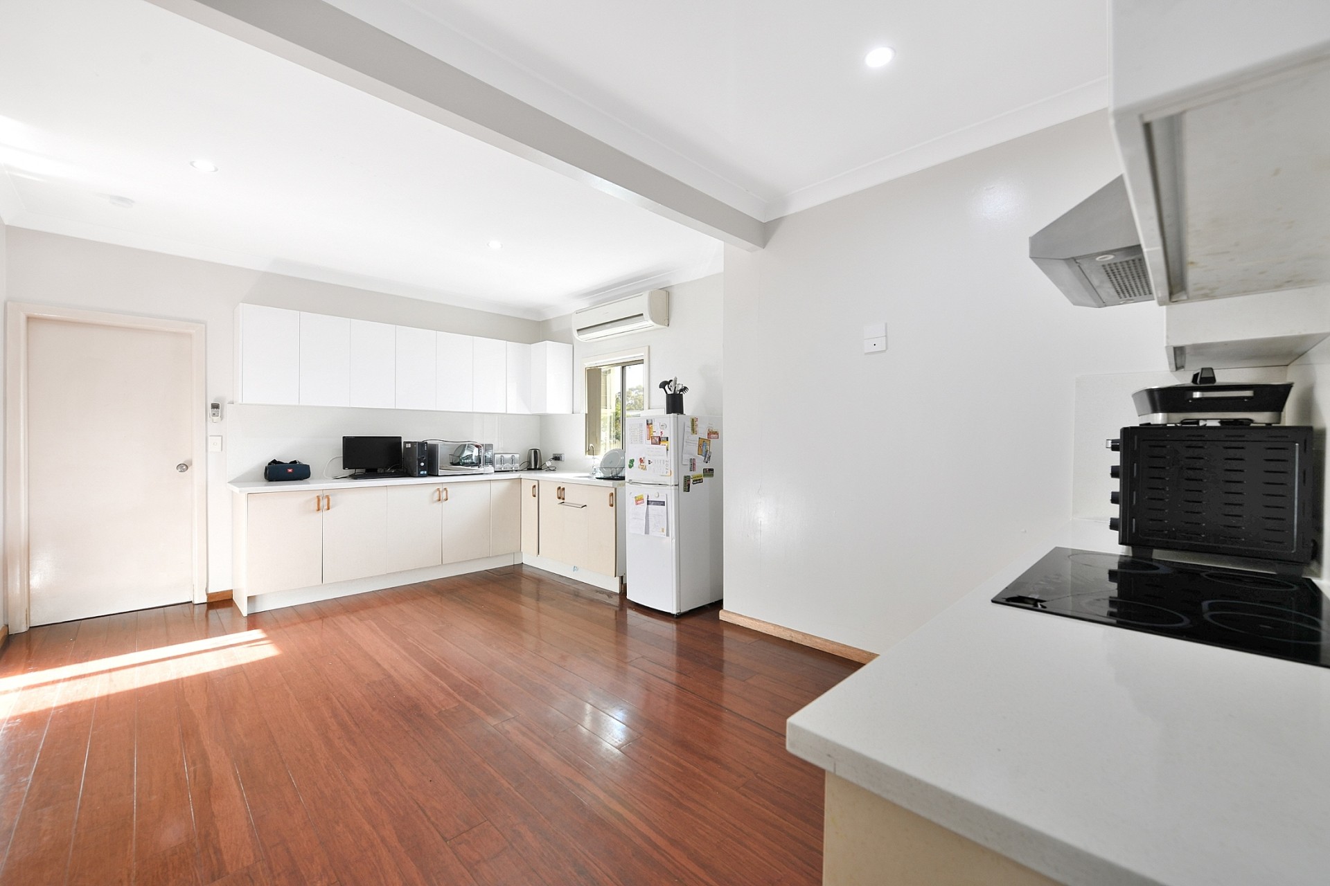 :: Updated kitchen boasts an electric cooktop and abundant storage, providing a functional and stylish hub for family meals