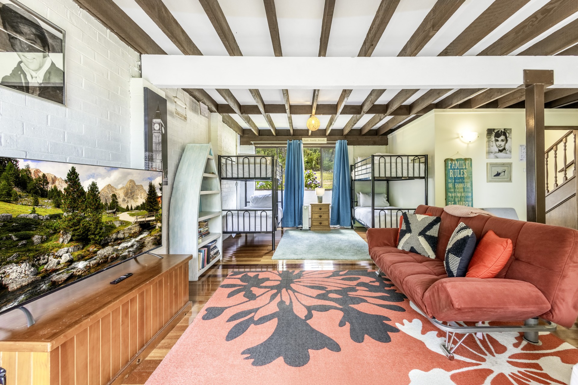 Downstairs rumpus room with TV, bunk beds, and comfortable seating - ideal for a kids retreat!