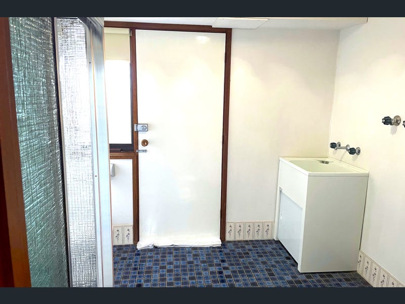 Bathroom 2 (Downstairs): Walk-in shower, toilet, laundry tub, and laundry facilities