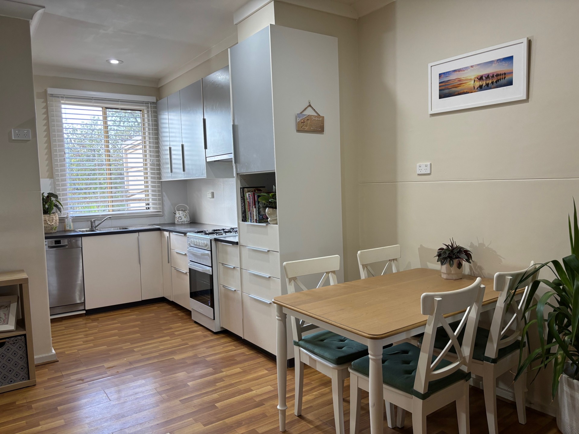 An internal renovation has opened up the living and dining areas creating light open plan living. Three bedrooms all have built in robes. The bathroom and laundry located at the back of the home have also undergone renovation with modern tiling and finishes. The kitchen has good storage with overhead cupboards, dishwasher and gas cooktop & oven and gas hot water. All rooms are fitted with modern white timber venetian blinds, giving the home a fresh contemporary feel. Timber flooring has been installed over original timber floorboards.