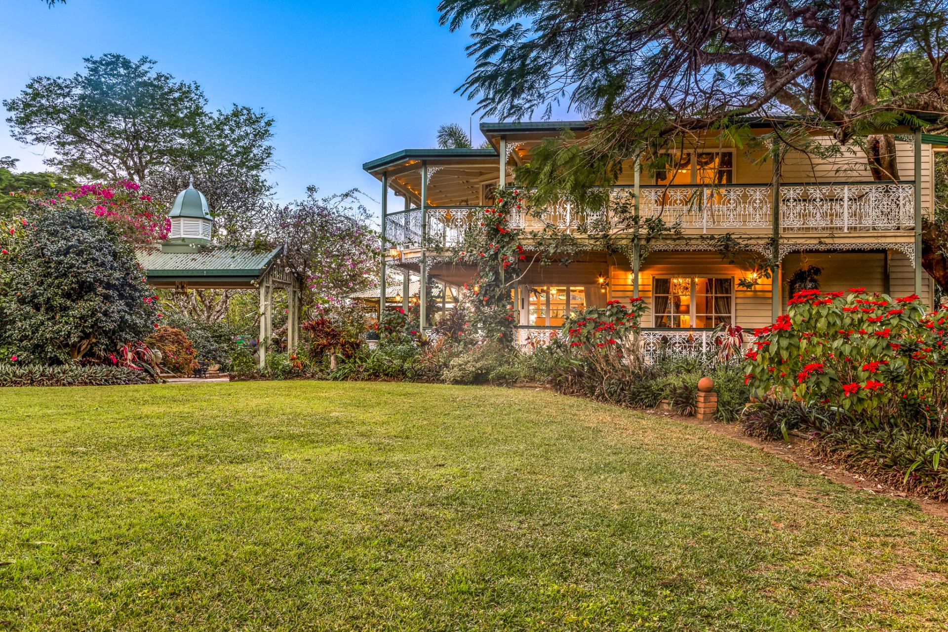 Here it is; 5.5 acres of manicured botanical gardens containing a huge collection of camellias, paddocks, specimen trees, large ornamental lake smothered in lilies and a ferry folly, huge 14 x 14 Heritage barn, large 6 x 9 workshop (3Ph power) or other hobby / leisure usage, separate toilets local to barn and shed. Large shade shed. 22kw solar. Picture perfect double storey Queenslander with verandahs on both levels: New roof, Concealed ducted zoned Inverter A/C, 3 double bedrooms, 3 bathrooms, huge kitchen, gorgeous dining, elegant lounge, separate media/TV room, study, parking for 17+. Saltwater pool, huge swim spa under cover.