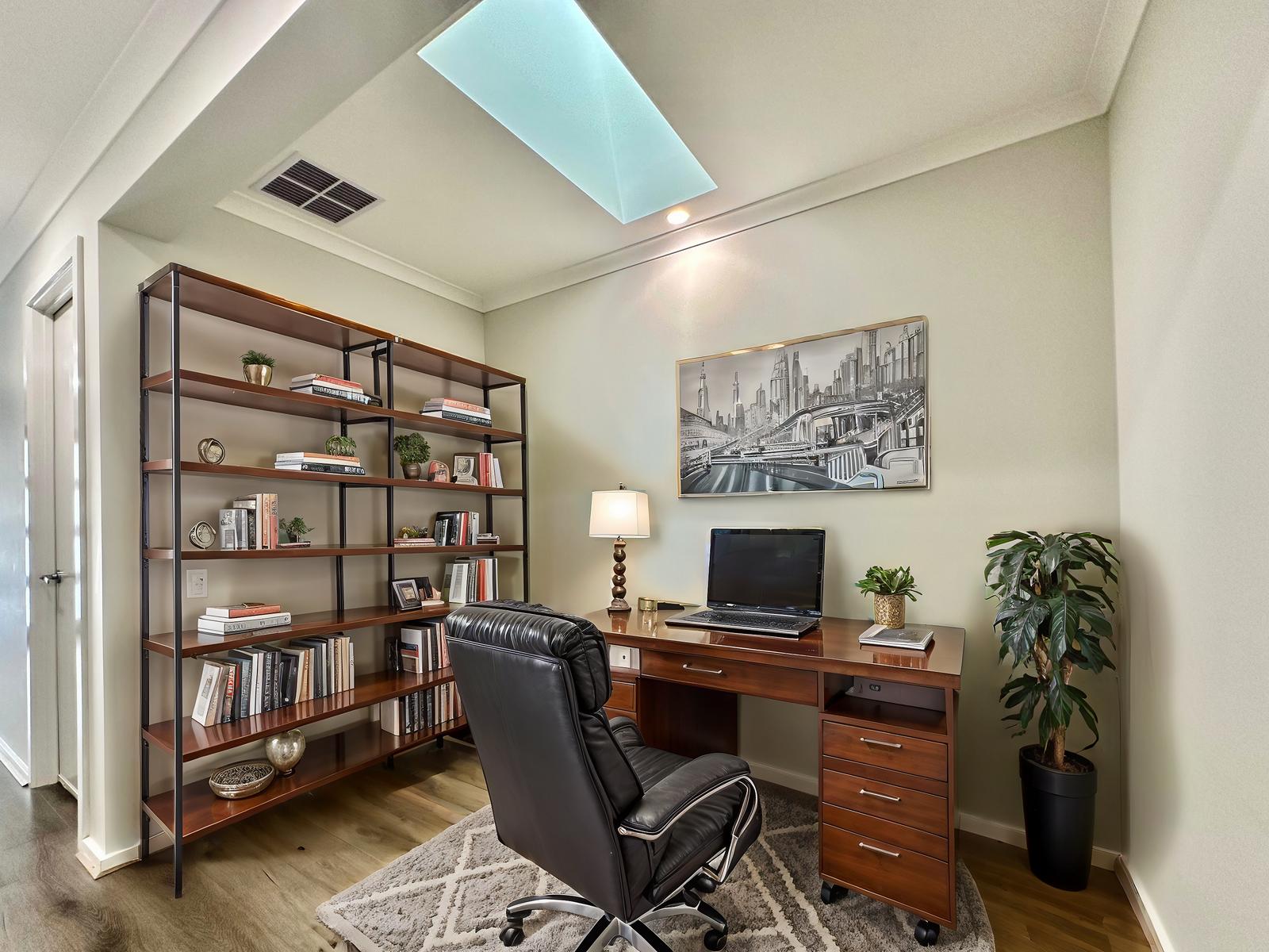 The home also features a dedicated study nook, perfect for a home office or study area. Positioned beneath a skylight, this bright and inspiring workspace is ideal for working from home or completing school assignments. A well-appointed laundry with ample storage, including both overhead and under-bench cupboards, ensures everything stays neatly organised.