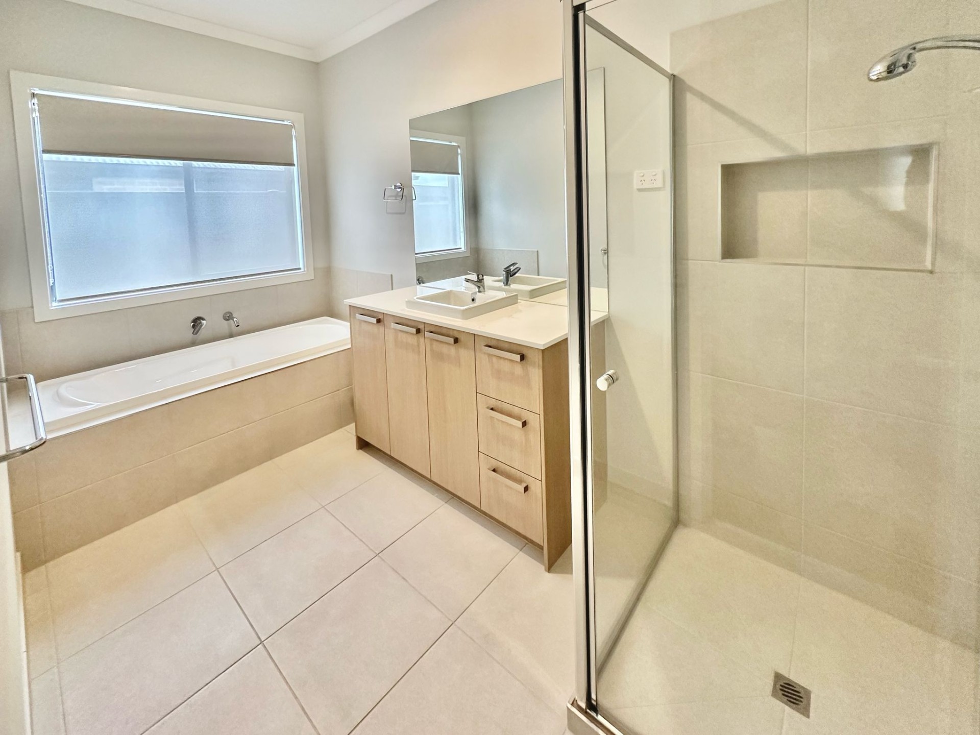 Three additional well-sized bedrooms, each with built-in robes, are positioned in their own wing, ensuring space and comfort for family members or guests. The spacious family bathroom, complete with a full-sized bath, separate shower, and generous vanity, is designed to accommodate busy households. A separate toilet adds further practicality, making mornings easier for everyone.