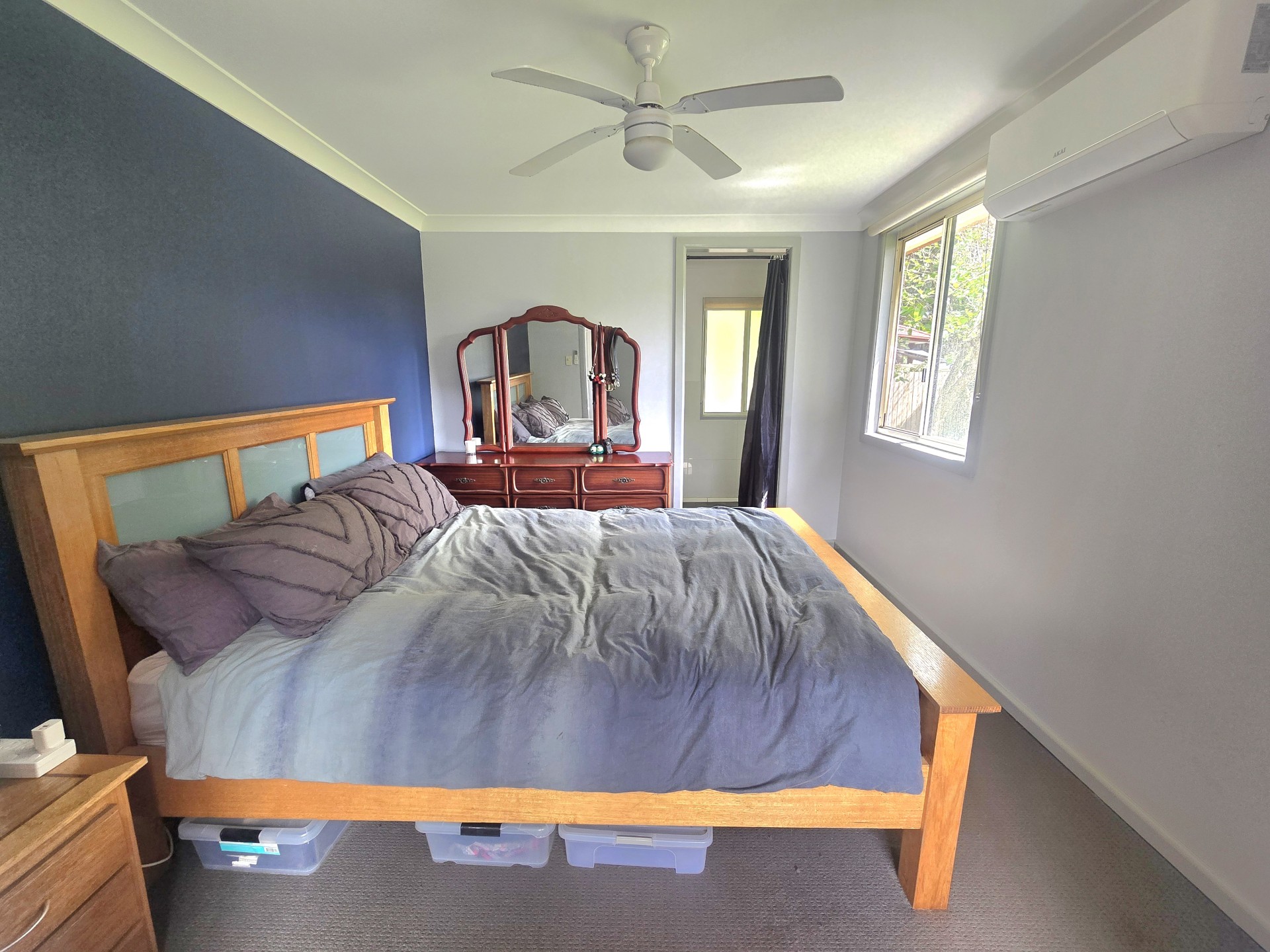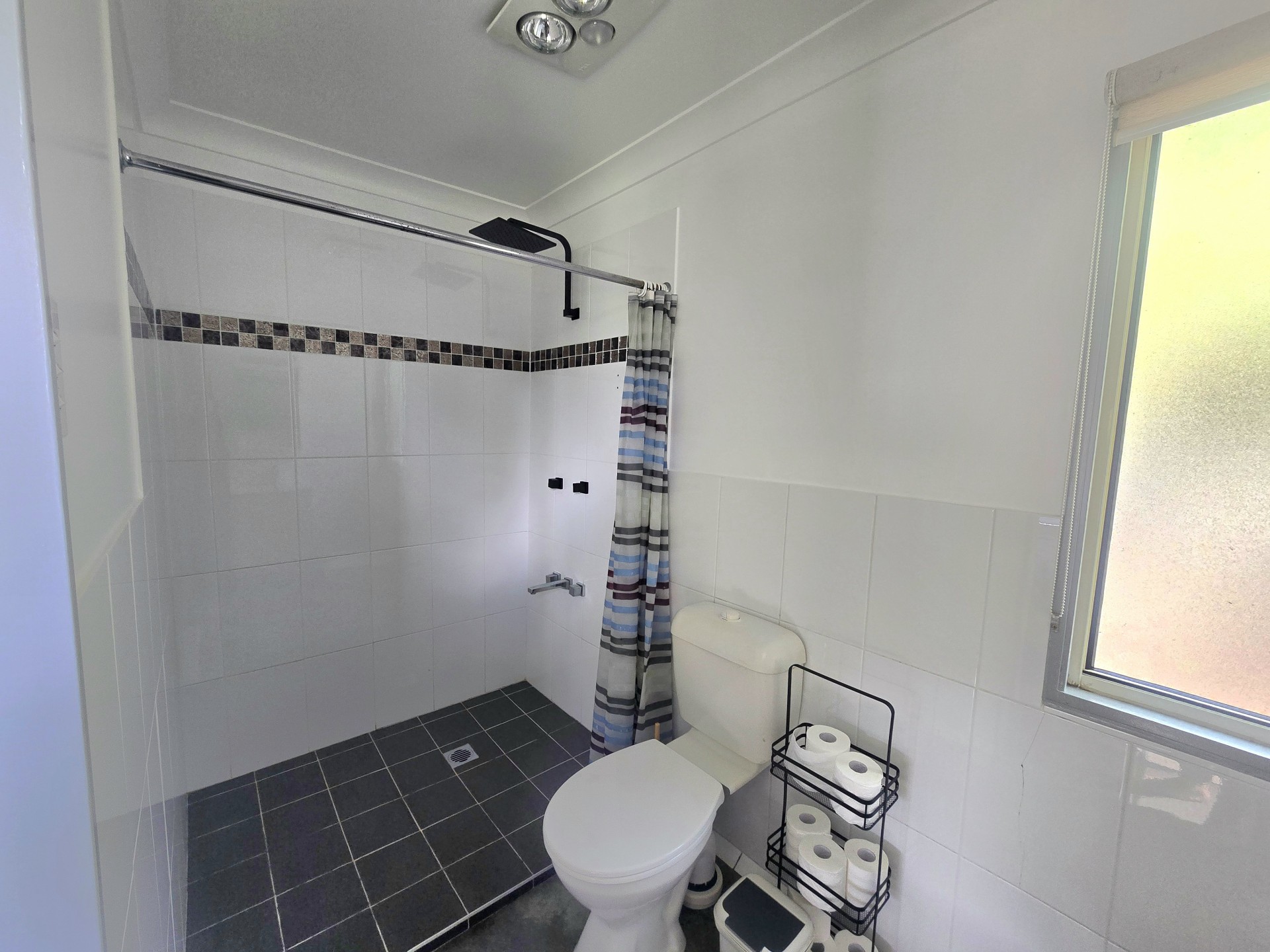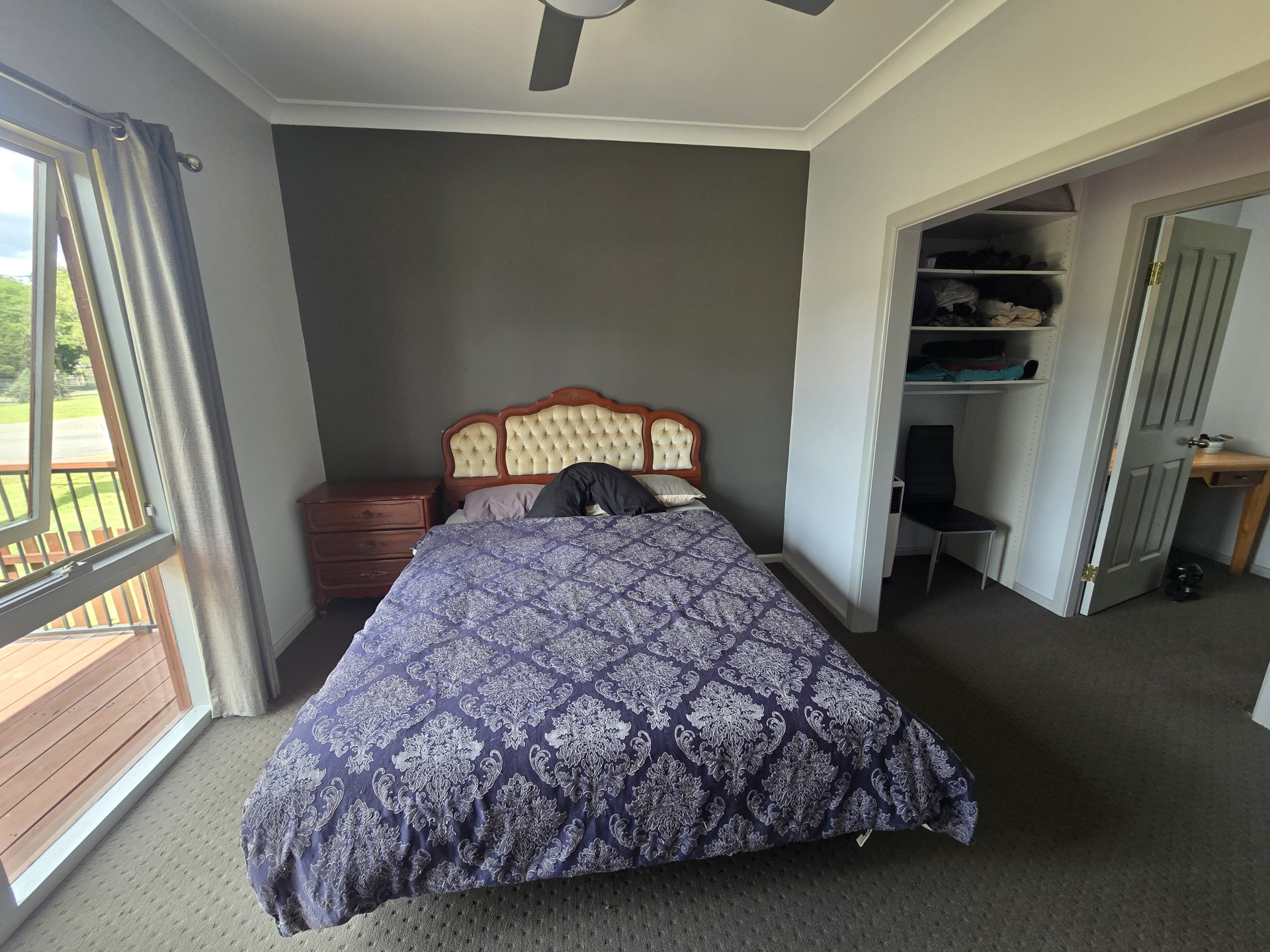 The spacious main bedroom sports a large walk in robe and ceiling fan, with a short distance from the main bathroom which is fitted with a shower/bath.