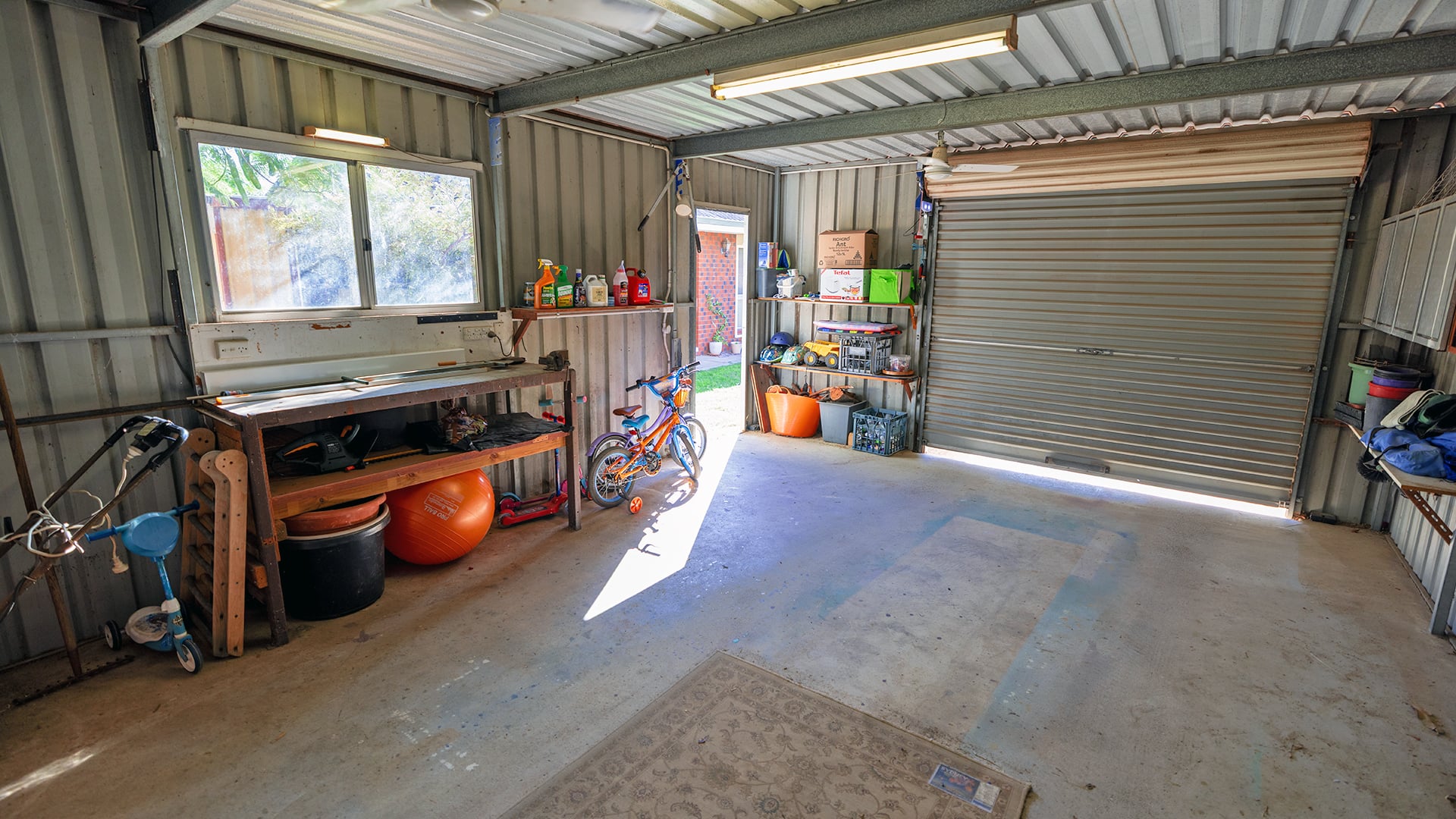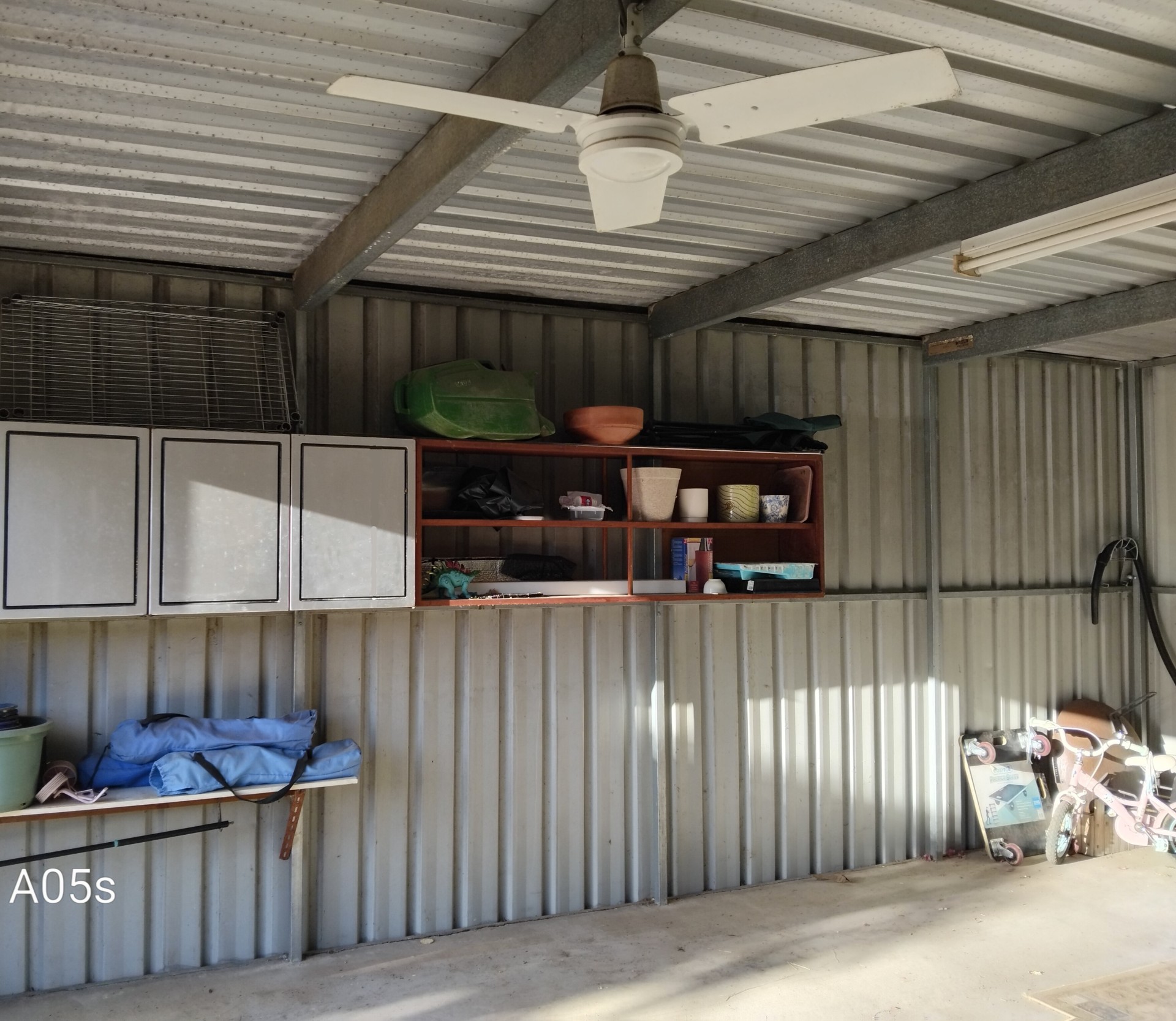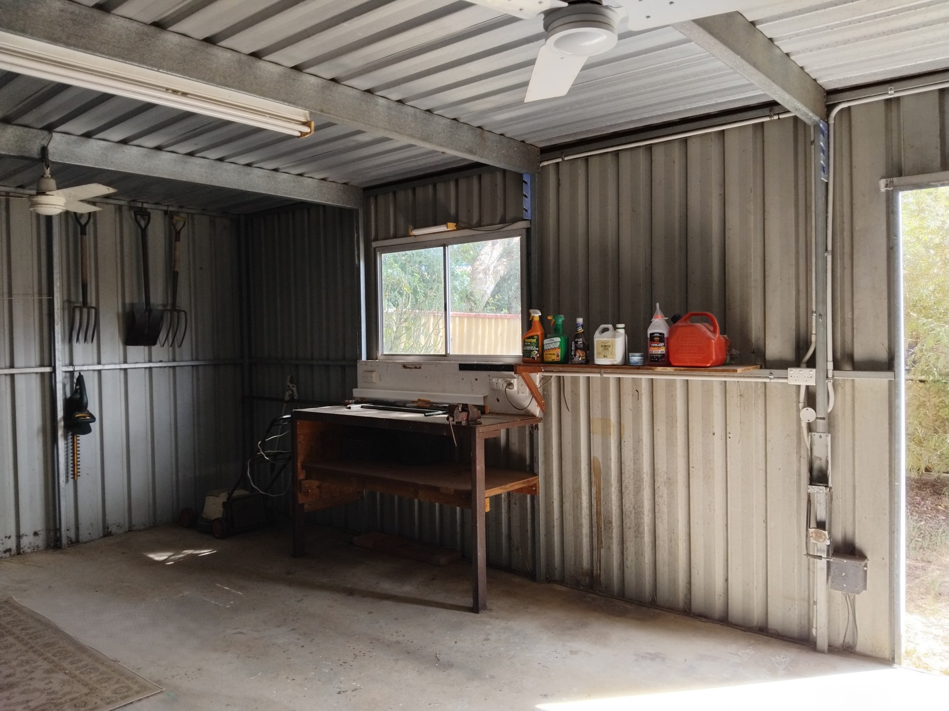 - A stand alone garage with automatic roller door, power, work bench, plenty of cupboard space, shelves and ceiling fans is located at the end of the driveway.