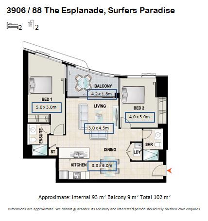 - Floor plan: Approximately Internal 93 m2 Balcony 9 m2 Total 102 m2.