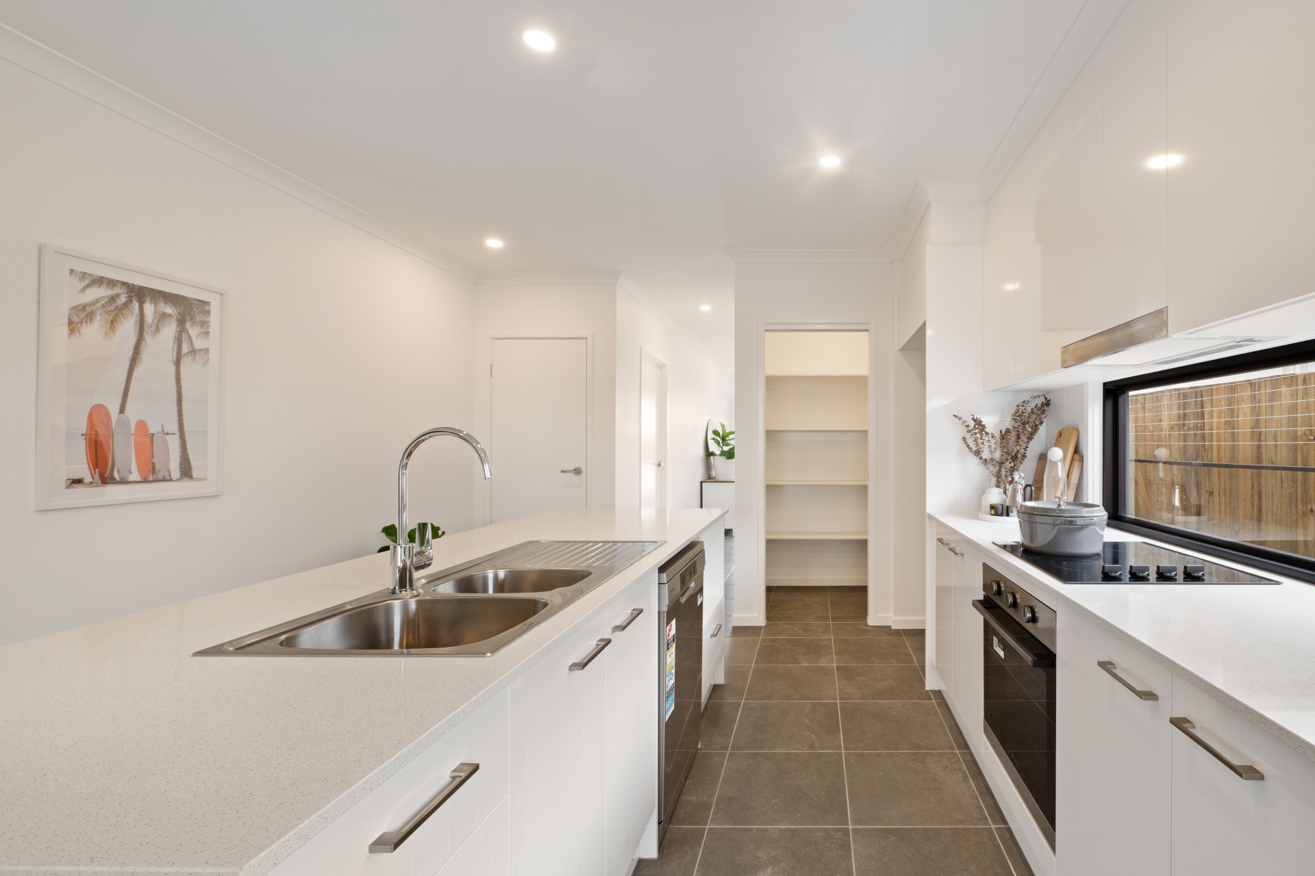 The galley-style kitchen features a walk-in pantry, stone benchtops and quality appliances.