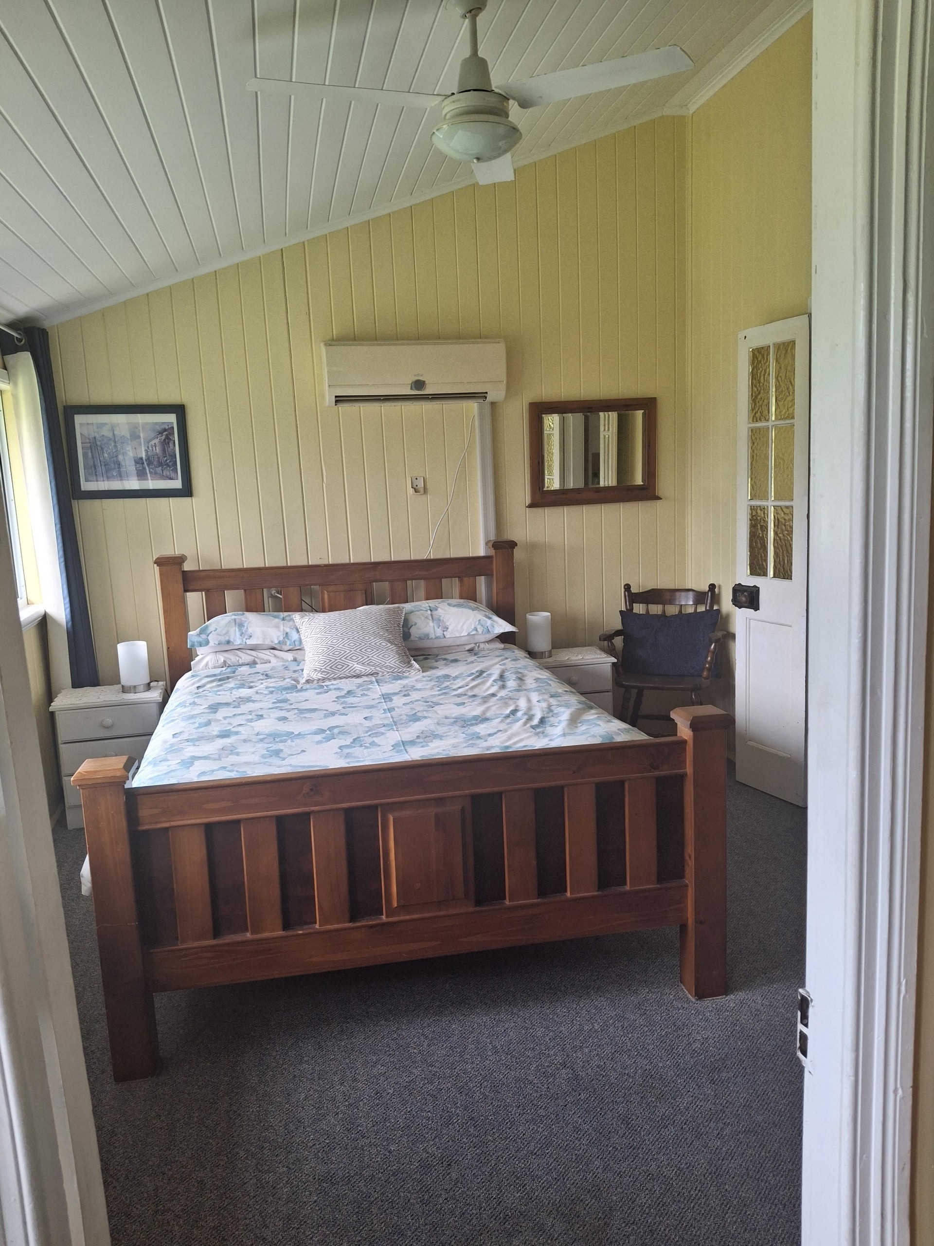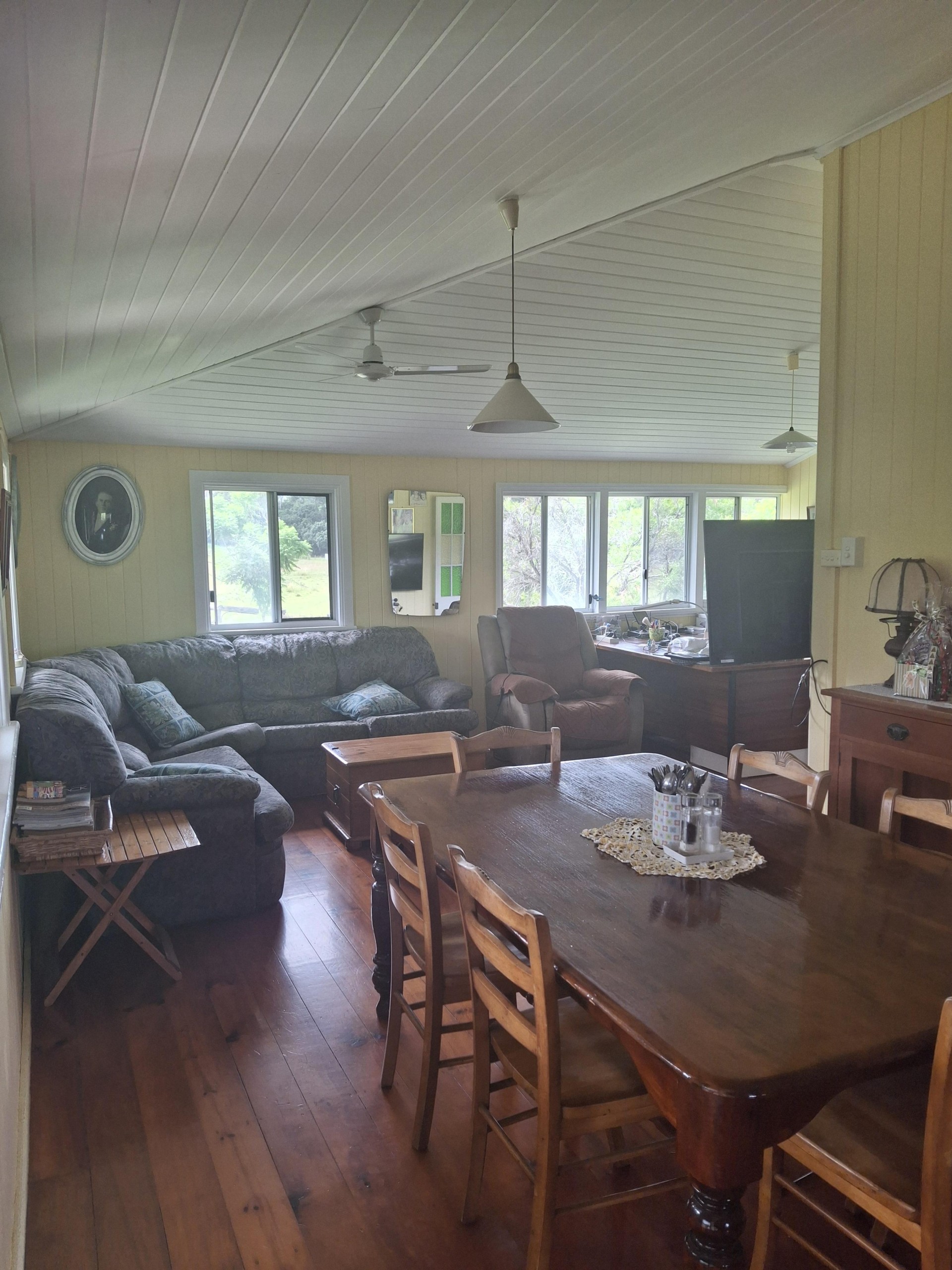 Four bedroom Queenland style farmhouse with a large north facing deck, features solid pine flooring, combined kitchen, dining and lounge, 11 ft high ceilings, two-way bathroom, walk-in robe, air conditioning, ceiling fans, pine tongue and groove walls and large family room. Farmstyle kitchen, walk-in pantry, dishwasher, built-in oven and cooktop, opening to the deck. Dog fenced house yard with cattle grid. Zoned Rural with Council bin service Rates $1200 half year.