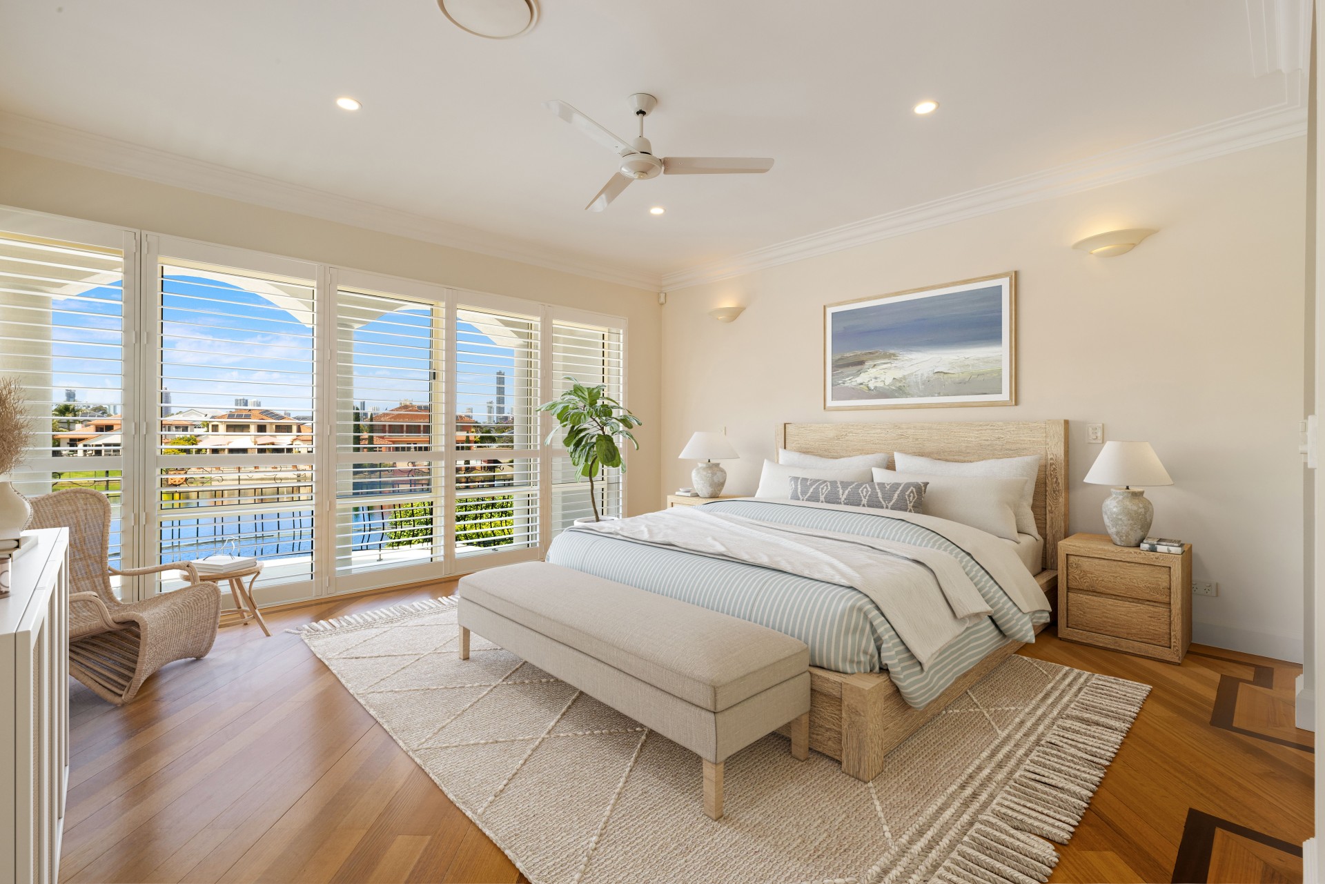 • Sprawling and sophisticated master suite with retreat, walk-through robe, spa ensuite and wrap-around balcony with water and skyline vistas;
