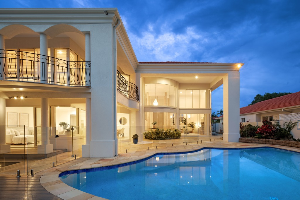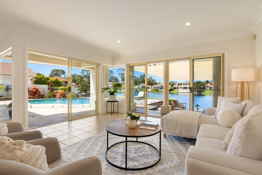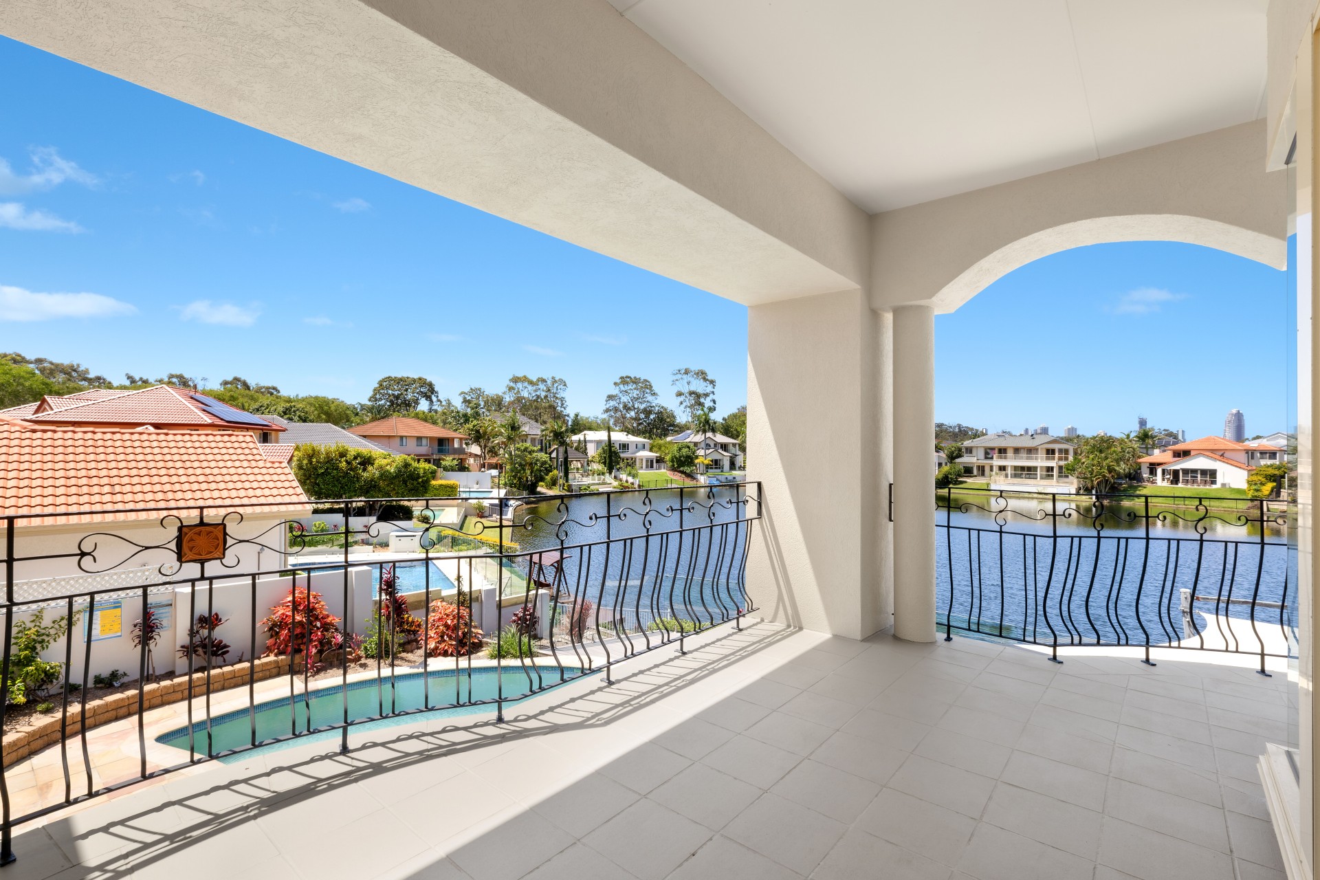 • Pool and decking, set against the backdrop of glistening waterways;