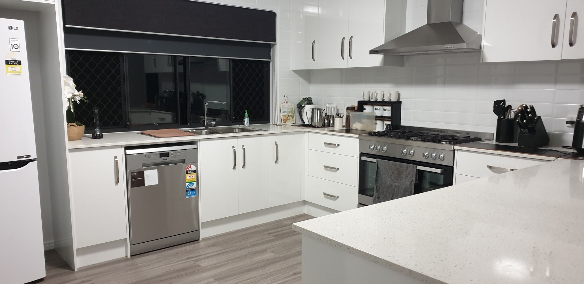 The well fitted kitchen with caesar stone bench tops, walk in pantry, Omega 900mm dual stove, Omega dishwasher, open plan kitchen/dining room with air con is perfect for entertaining. The 2 large glass sliding doors in the dining room give great views of the garden with no neighbour in sight. The home consists of 4 bedrooms . 2 bathrooms . Laundry , closed off media room ,walk in linen cupboard. The main bedroom having ensuite , walk in wardrobe, air con and would easily fit a king size bedroom suite . The 3 bedrooms have built in mirrored wardrobes another air con in the guest bedroom , ceiling fans throughout. Instant lpg gas hot water. Town water+7000 litre rain water tank. Double garage with remote control door. 40ft high cube shipping container with new window installed . Single Carport with 3000 litre rain water tank. Small garden shed. Security screens throughout. Ceiling fans in every room.