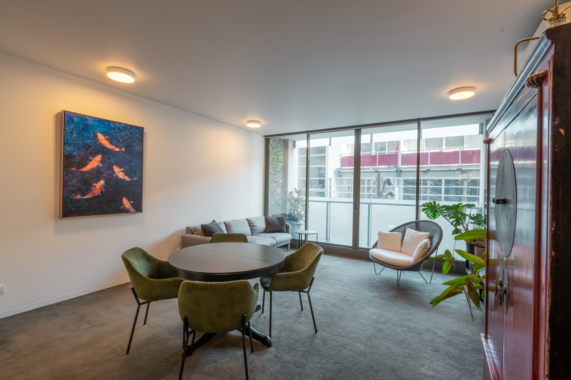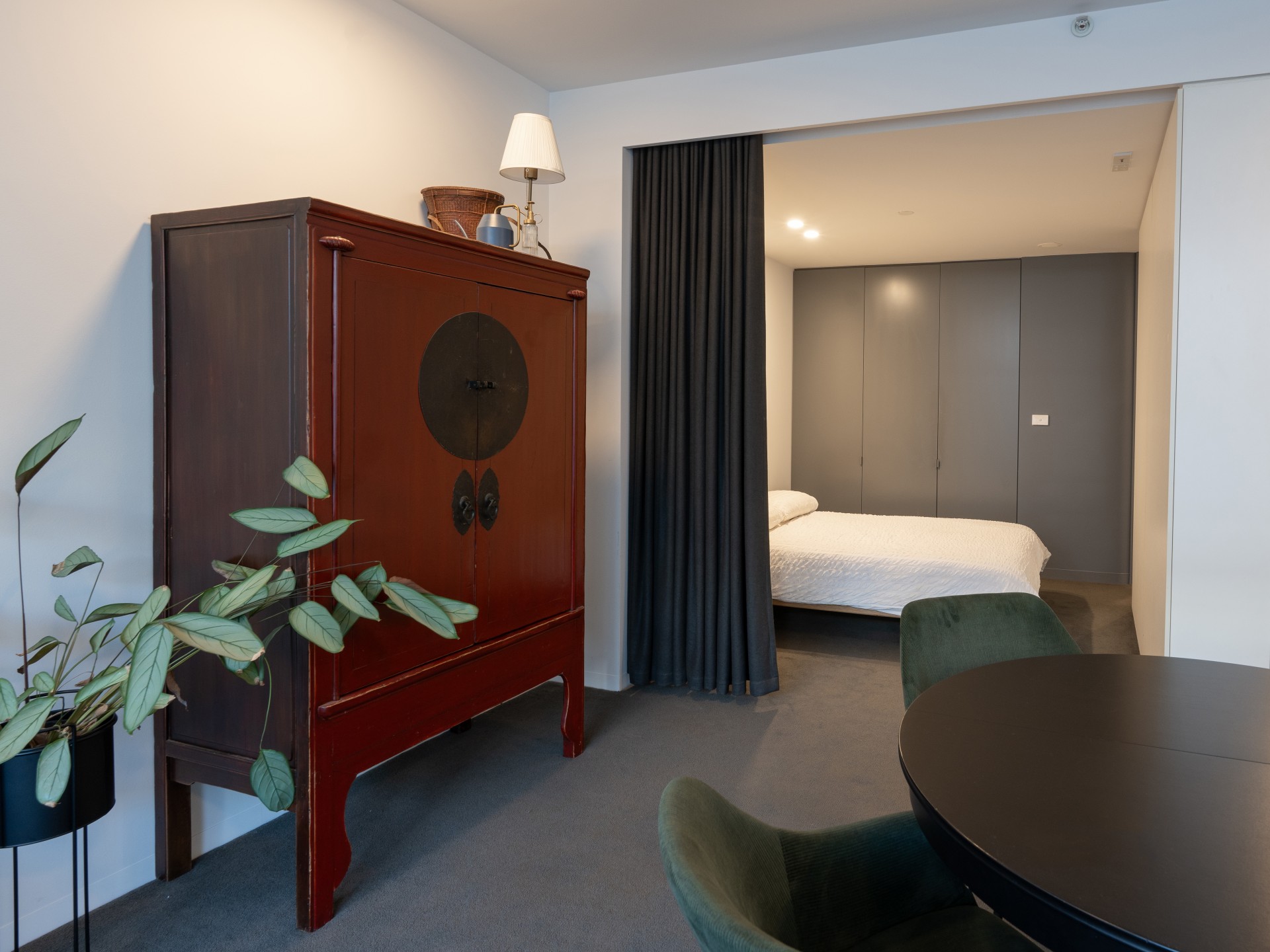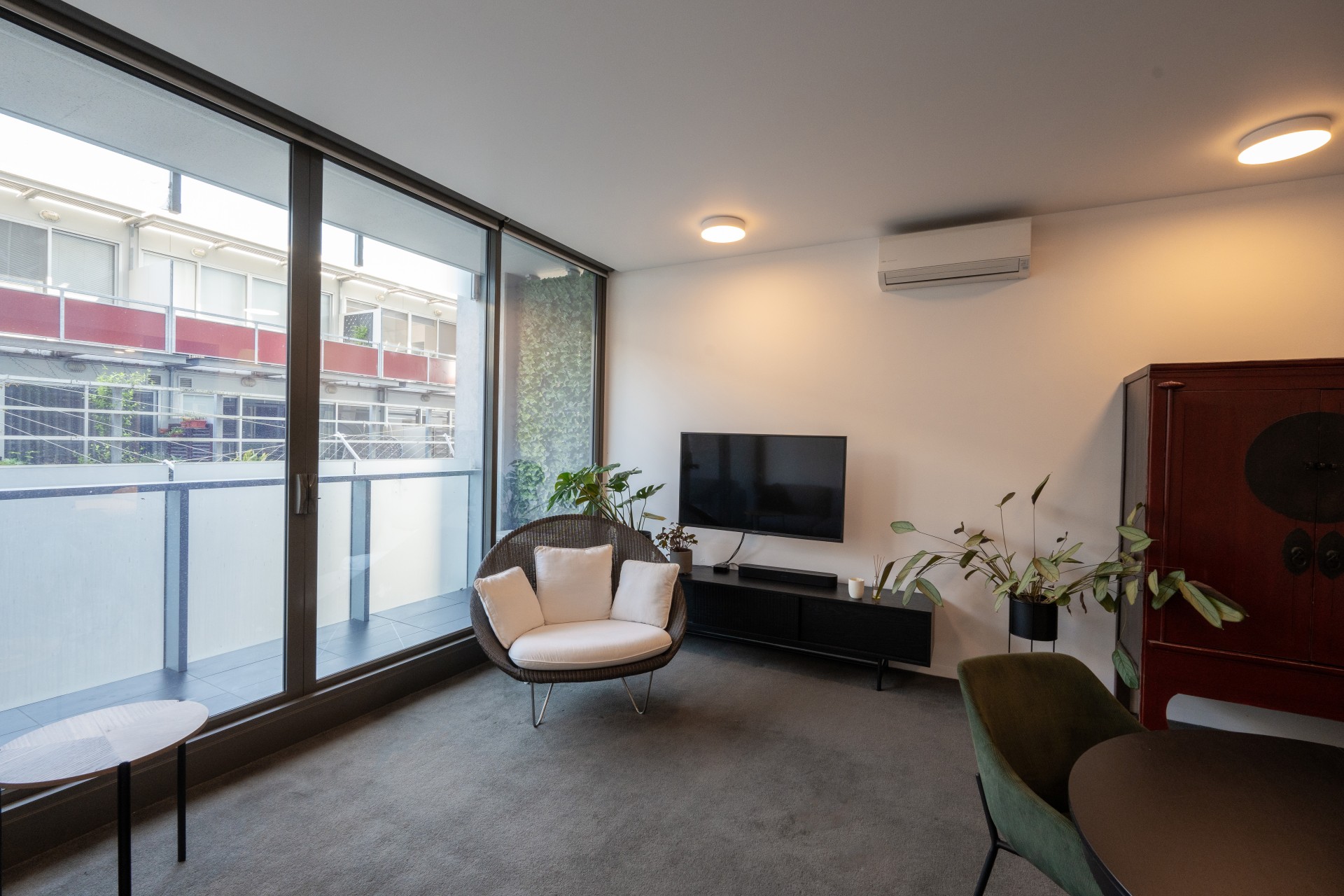 Perfectly positioned within Prahran's iconic 'Rue de Chapel' complex, this stunning one bedroom apartment by the acclaimed SJB architects offers a stylish inner-city experience. The open plan living area is bright and versatile, with split system heating/cooling and floor to ceiling windows overlooking the spacious balcony, as well as a sleek kitchen with tons of storage with SMEG appliances including integrated oven & dishwasher. The good-sized bedroom has built in robes, and the designer bathroom features a unique and spacious circular shower. The apartment has been recently repainted, with electric blinds and modern LED ceiling lighting installed. Additional features include a euro laundry, a storage cage on the same floor, secure entry, and access to a communal rooftop garden with BBQ. Rue de Chapel is situated in the pedestrian-only King St, on the corner of Chapel & King St allowing access to all the area has to offer including tennis courts, Prahran Pool, Greville St shops and Prahran Train Station.