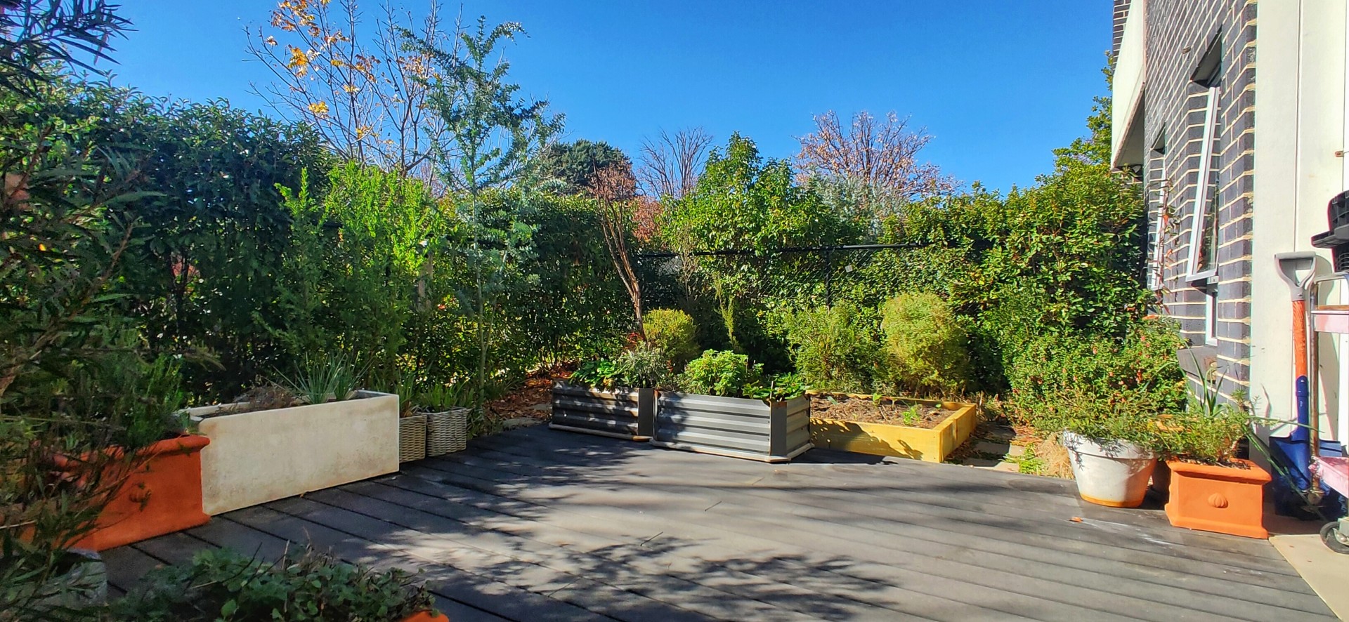 The apartment's lovely open plan living and dining areas open to a generous established courtyard, screened by shrubs and with plenty of room for growing vegetables.