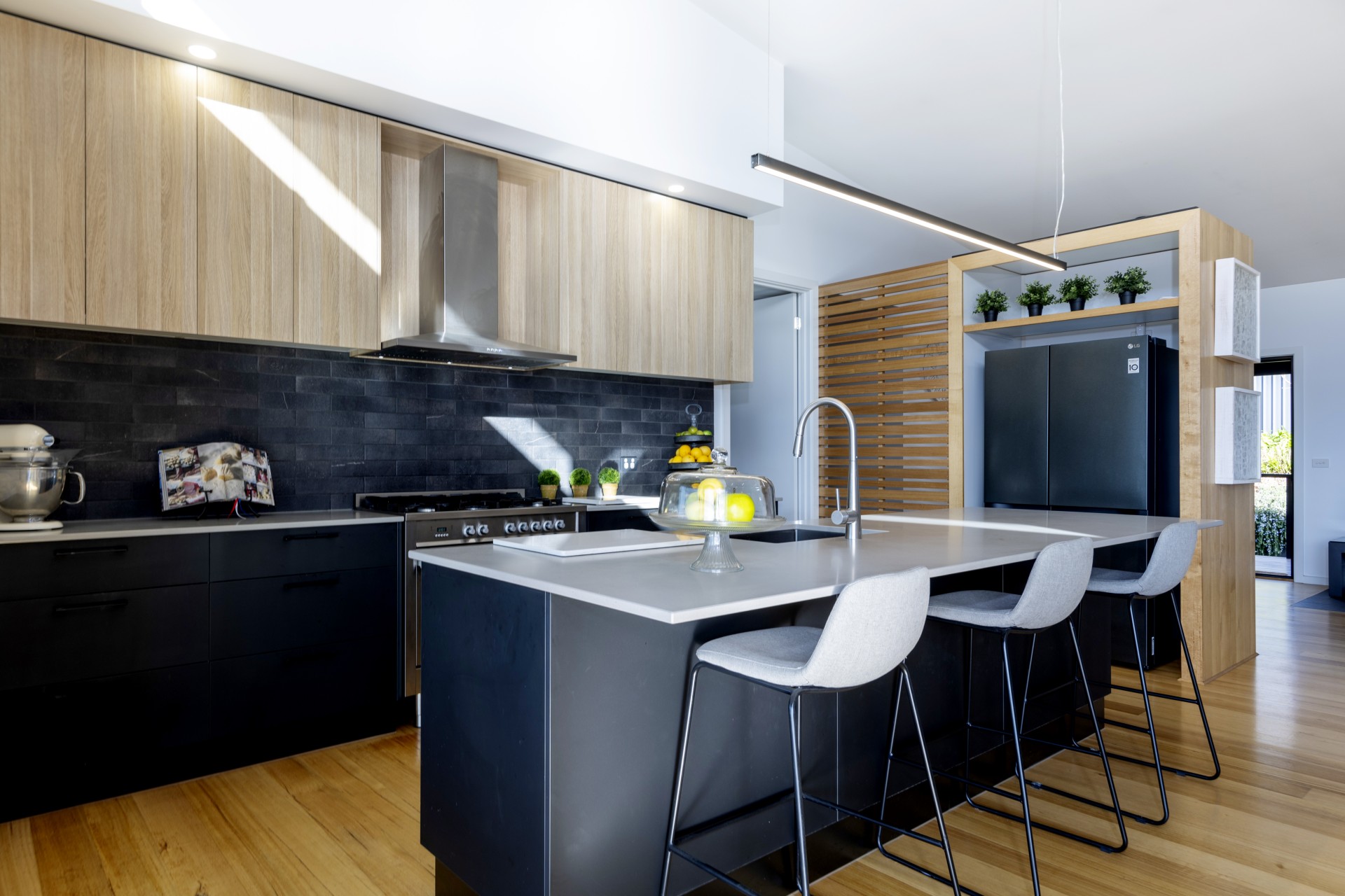 - Recycled bricks, Axon cladding, Tasmanian Oak and Blackbutt timbers.