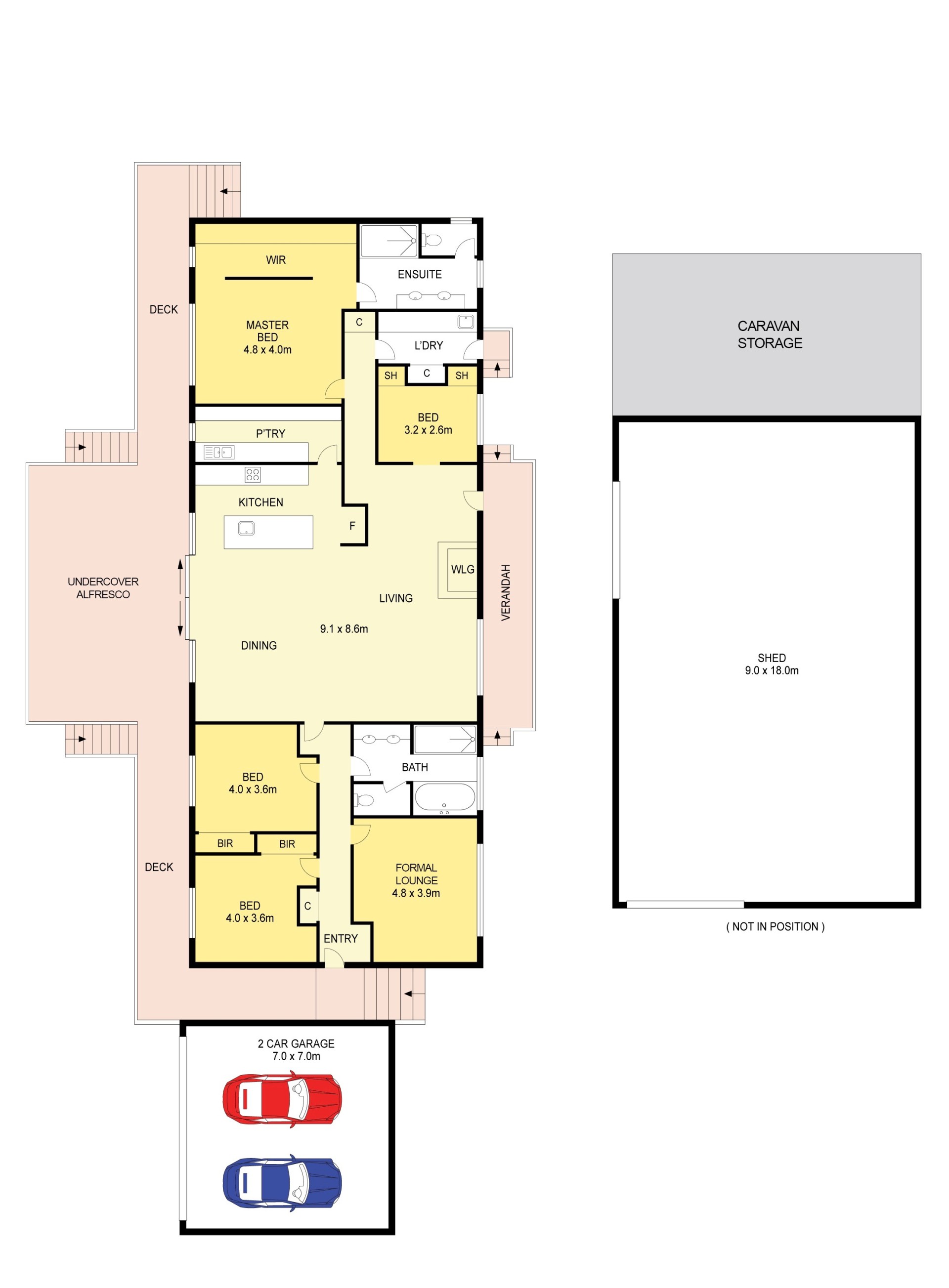 A dual concrete driveway surrounds the property leading to a 7m x 7m garage and parking space at the side of the residence. Found at the rear of the property is an 18m x 9m colorbond shed complete with power, lights, 9m x 3.6m mezzanine storage area, 4.5m x 3.6m insulated room and 3.8m height heavy duty electric roller doors.