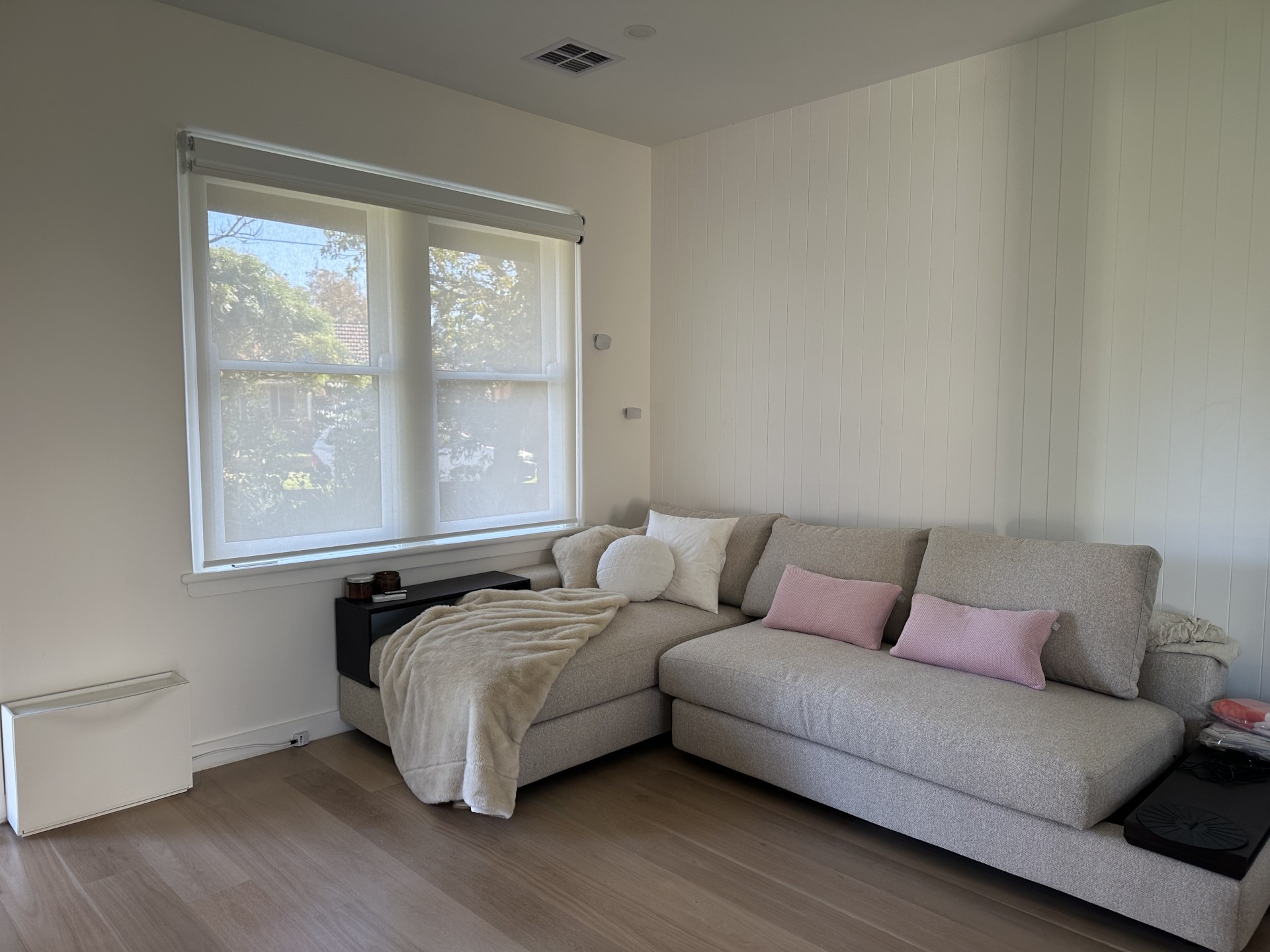 Bright living room with plush heated couches