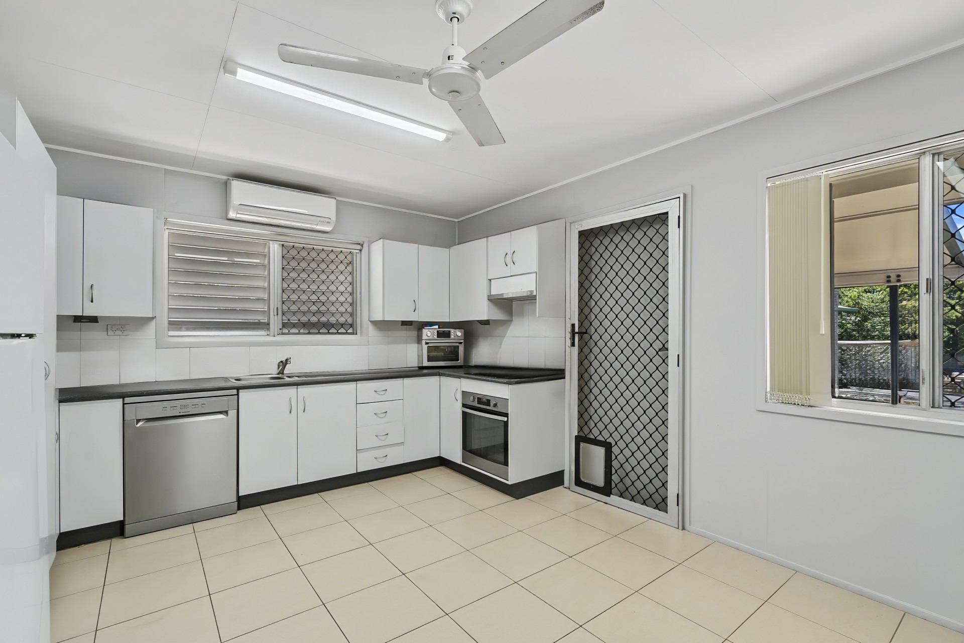 Open-plan kitchen/dining with large pantry, electric cooktop, oven & dishwasher