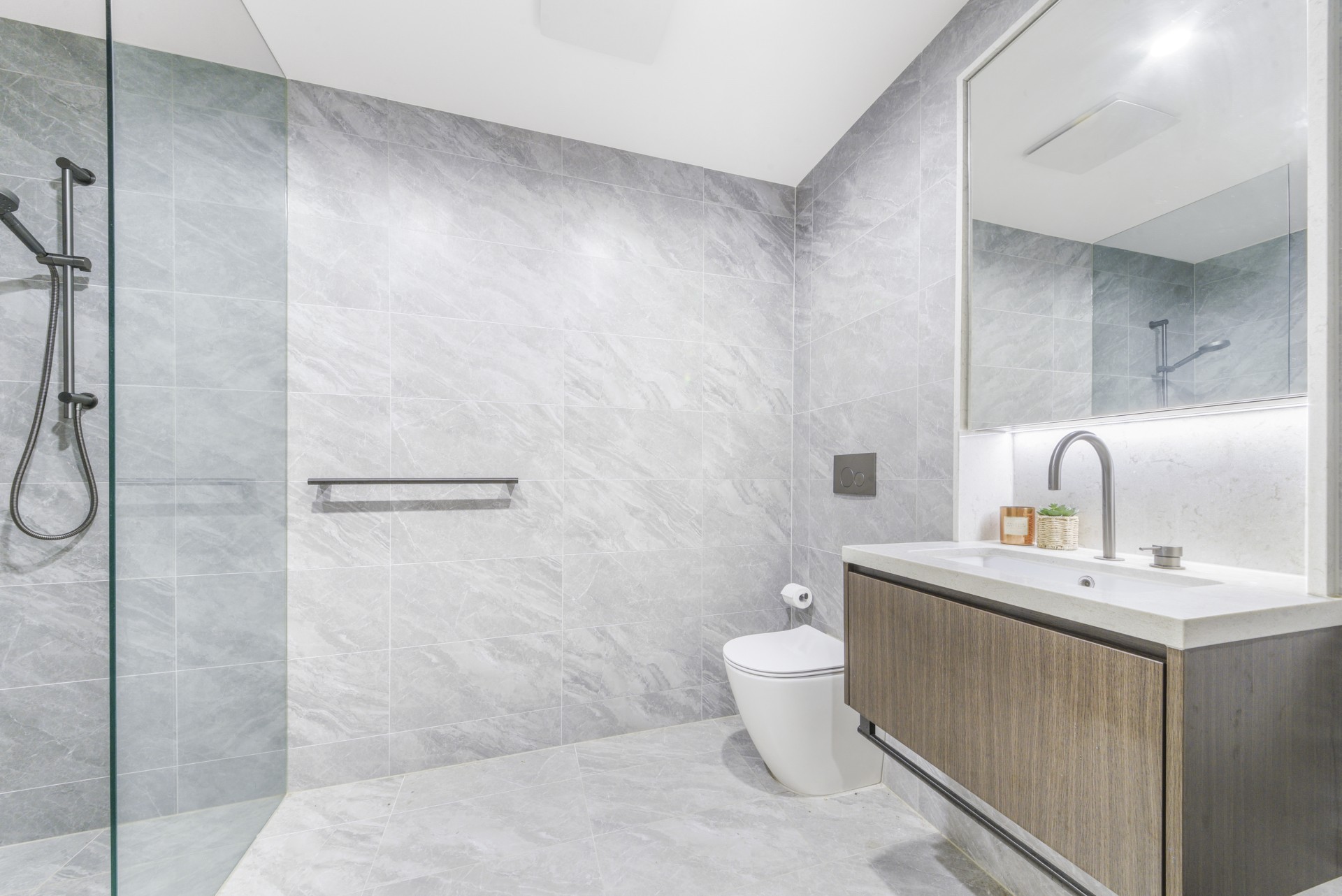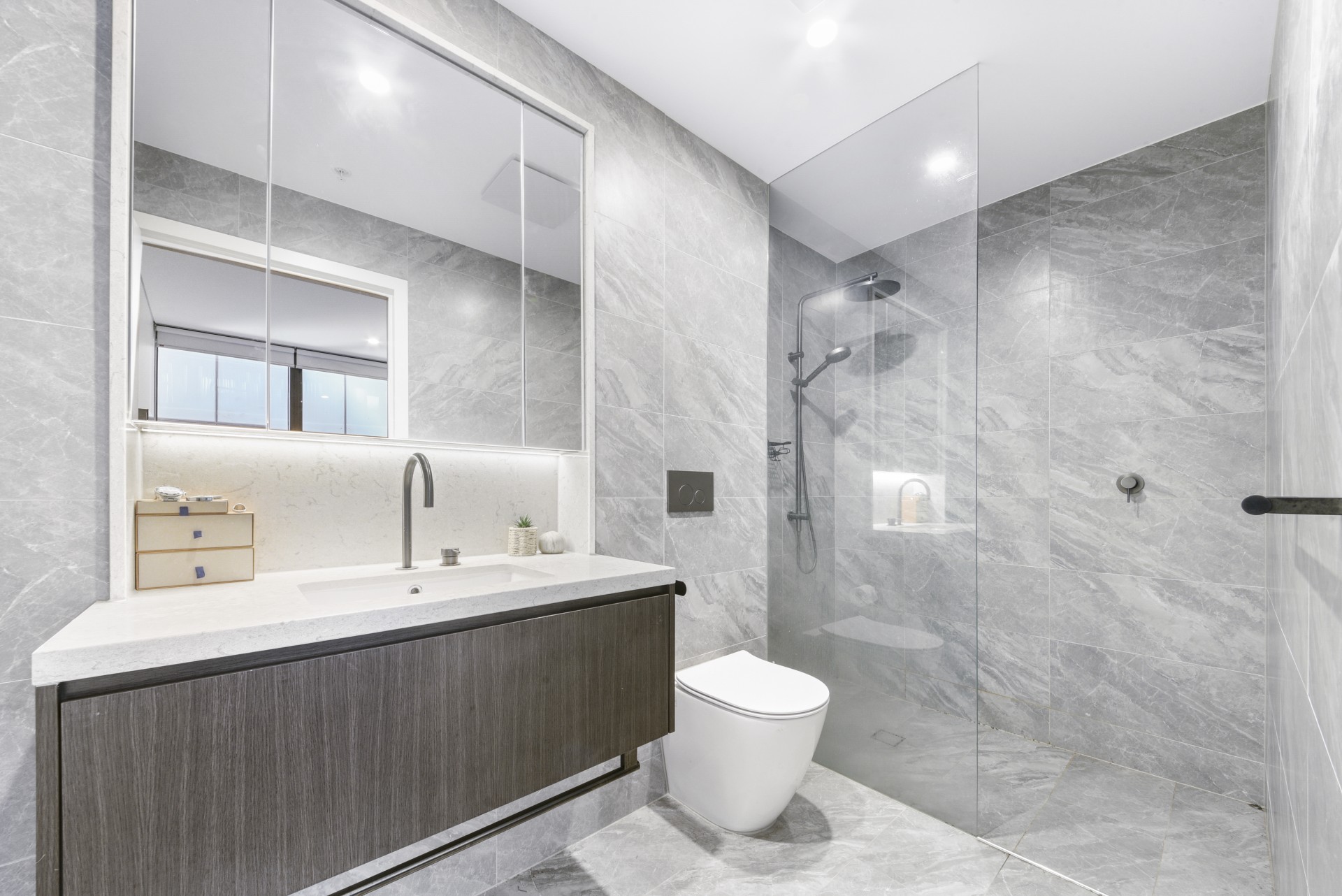 - Contemporary bathrooms with sleek mirrored vanity cabinets