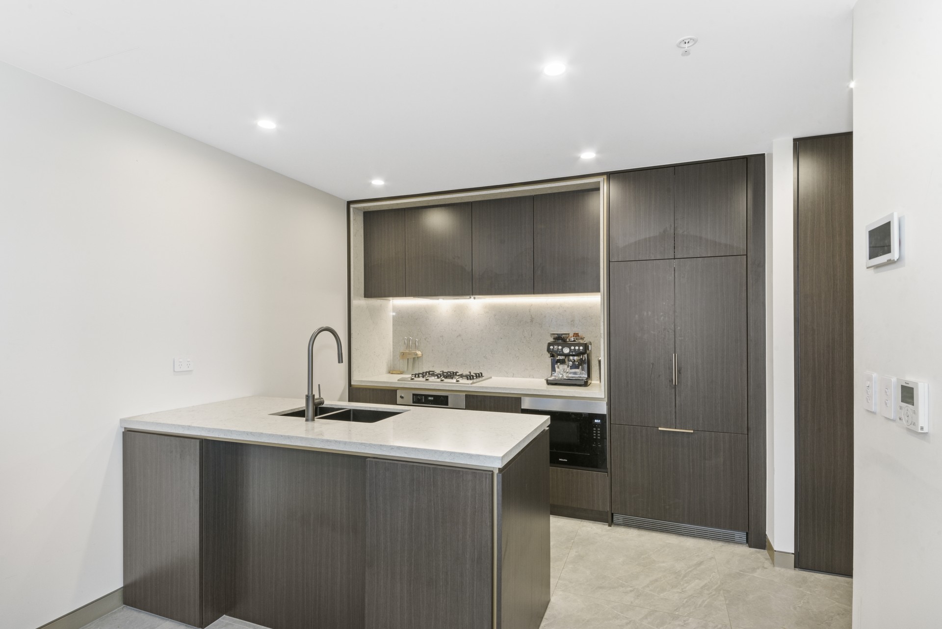 - Gourmet kitchen featuring designer countertops, Miele gas cooktop, microwave, dishwasher, range hood, oven and built-in fridge