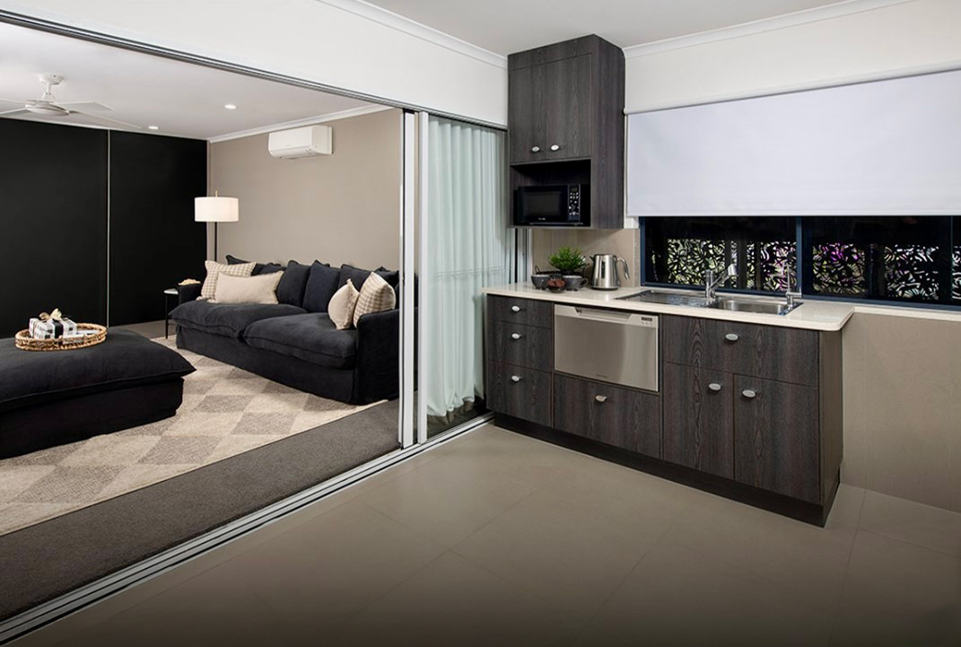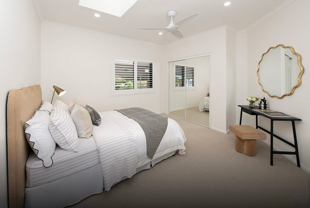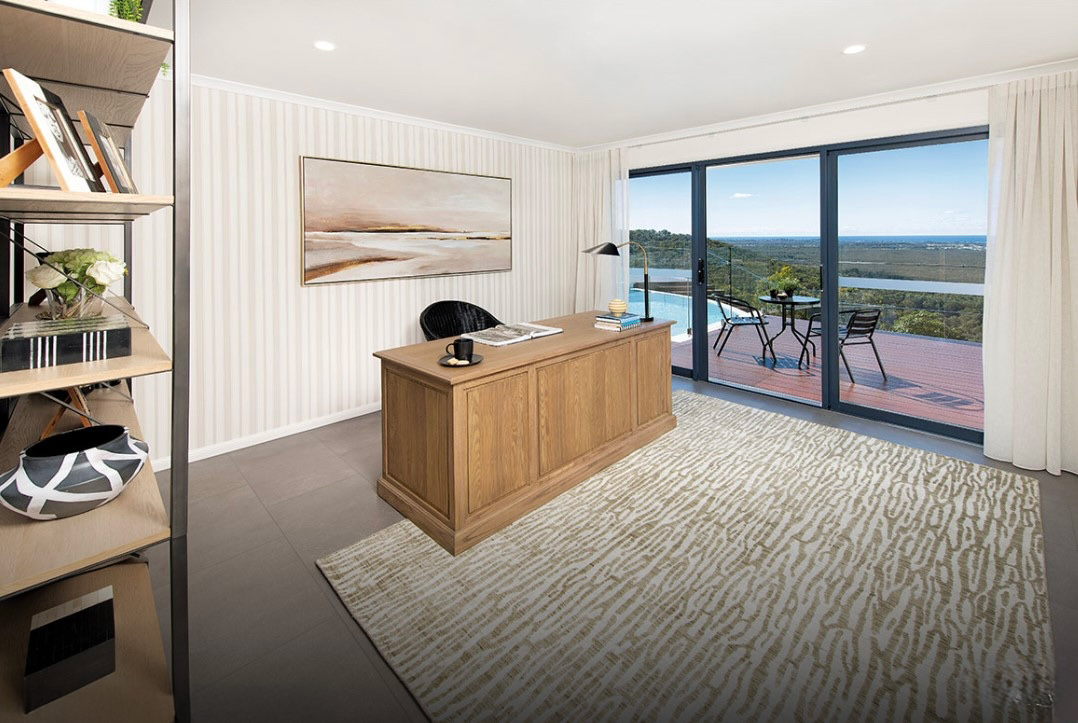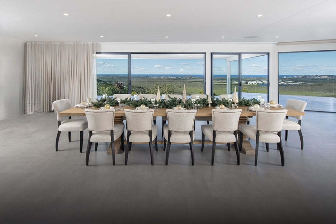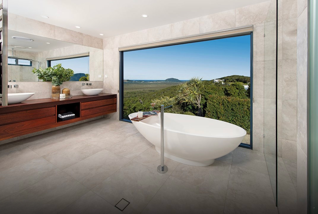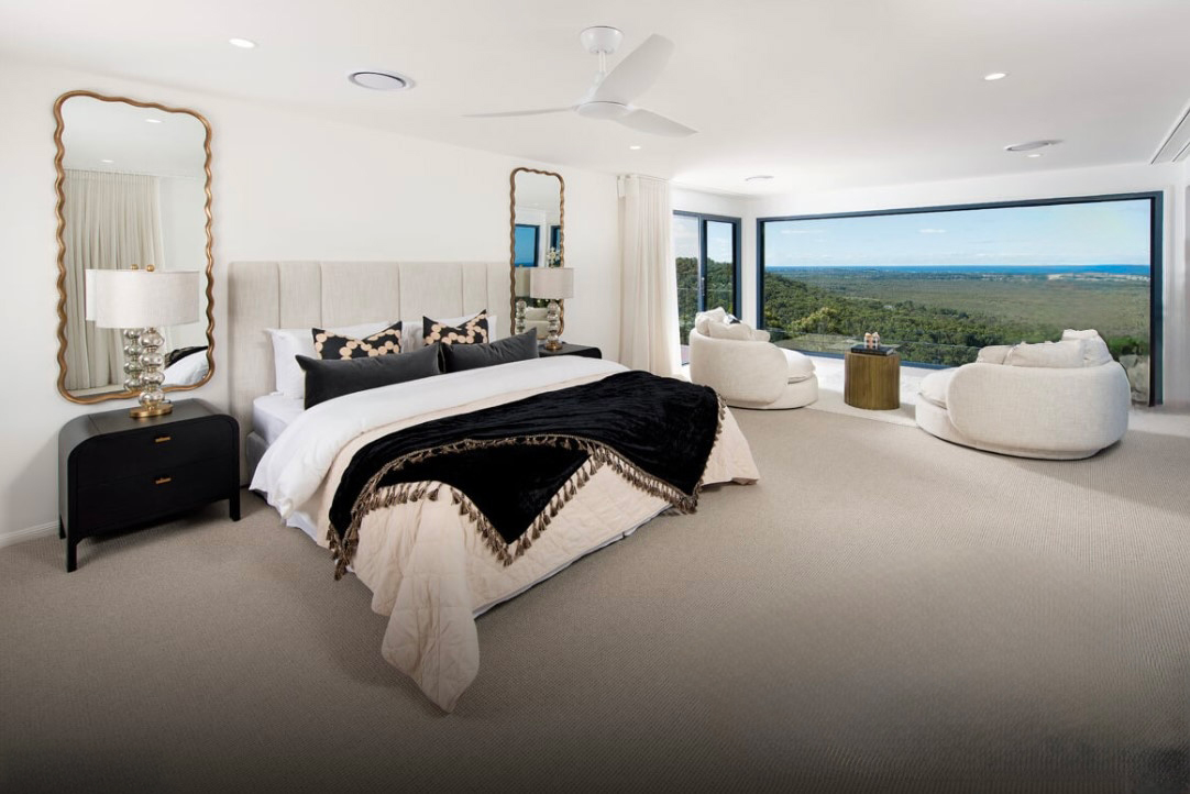 A SANCTUARY FOR THE SOUL- retreat to the main bedroom, a haven of tranquillity with panoramic views that almost envelop the room. Begin each day with a coffee in the sitting area, surrounded by the serene ambiance of the hinterland and ocean. Luxuriate in the ensuite, complete with a double shower, heated towel rails, and a freestanding bath overlooking endless vistas.