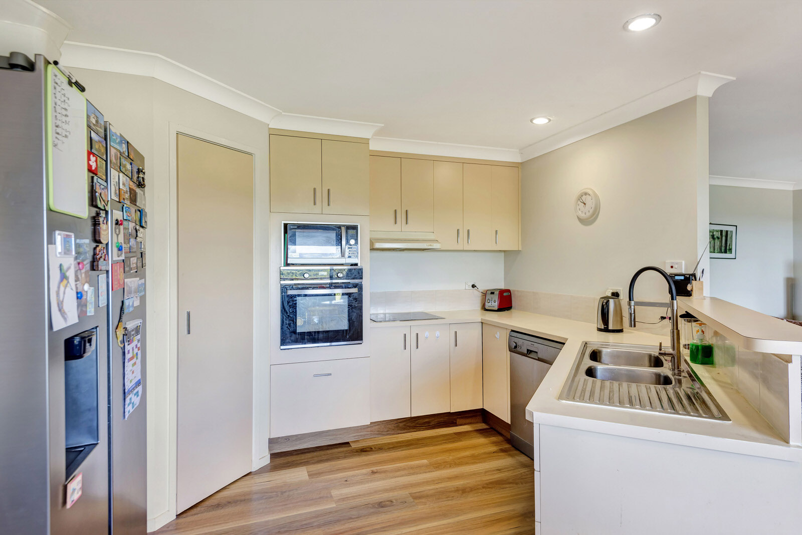 The house has two large living areas. The dining area sits between them next to an ergonomically designed kitchen which has lots of storage space and a walk in pantry. The cooktop is a powerful induction stove and there's a wall oven and microwave and a dishwasher too.