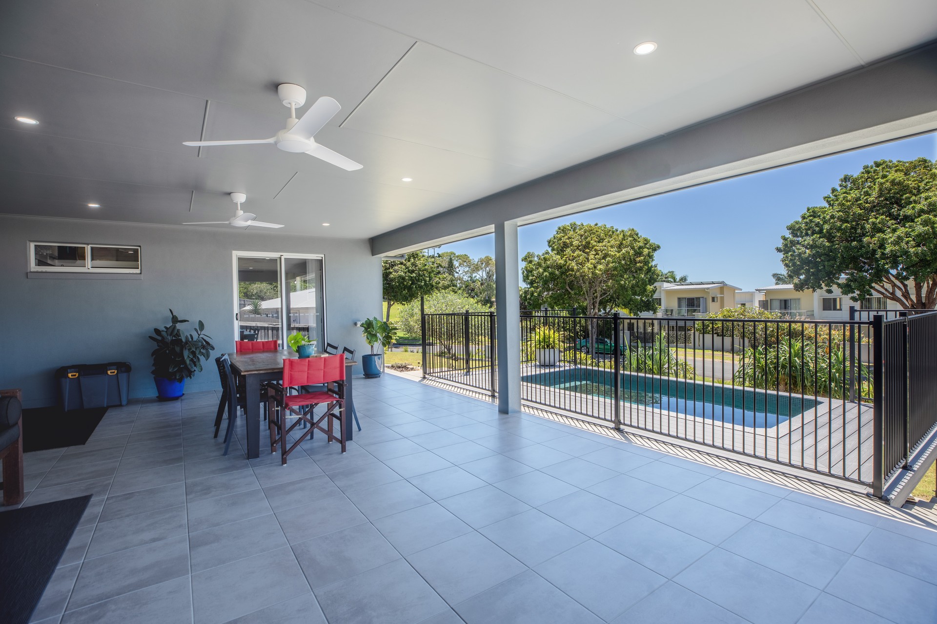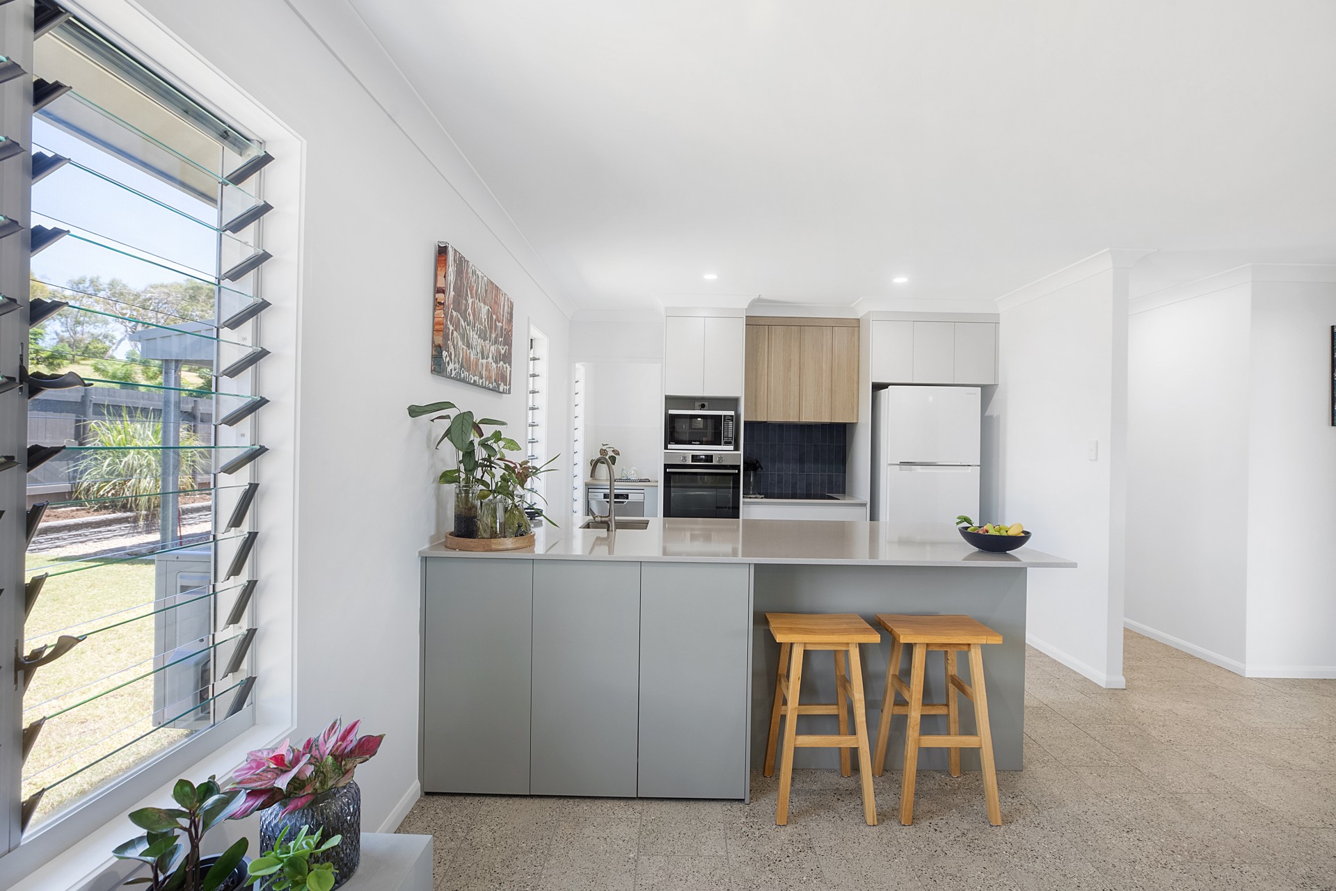 Designed to harness the cooling coastal breezes, the flow-through floorplan features wide corridors, louvres, and expansive sliding doors, ensuring natural ventilation and year-round comfort. Fully tiled throughout, the home offers easy-care living with a timeless aesthetic.