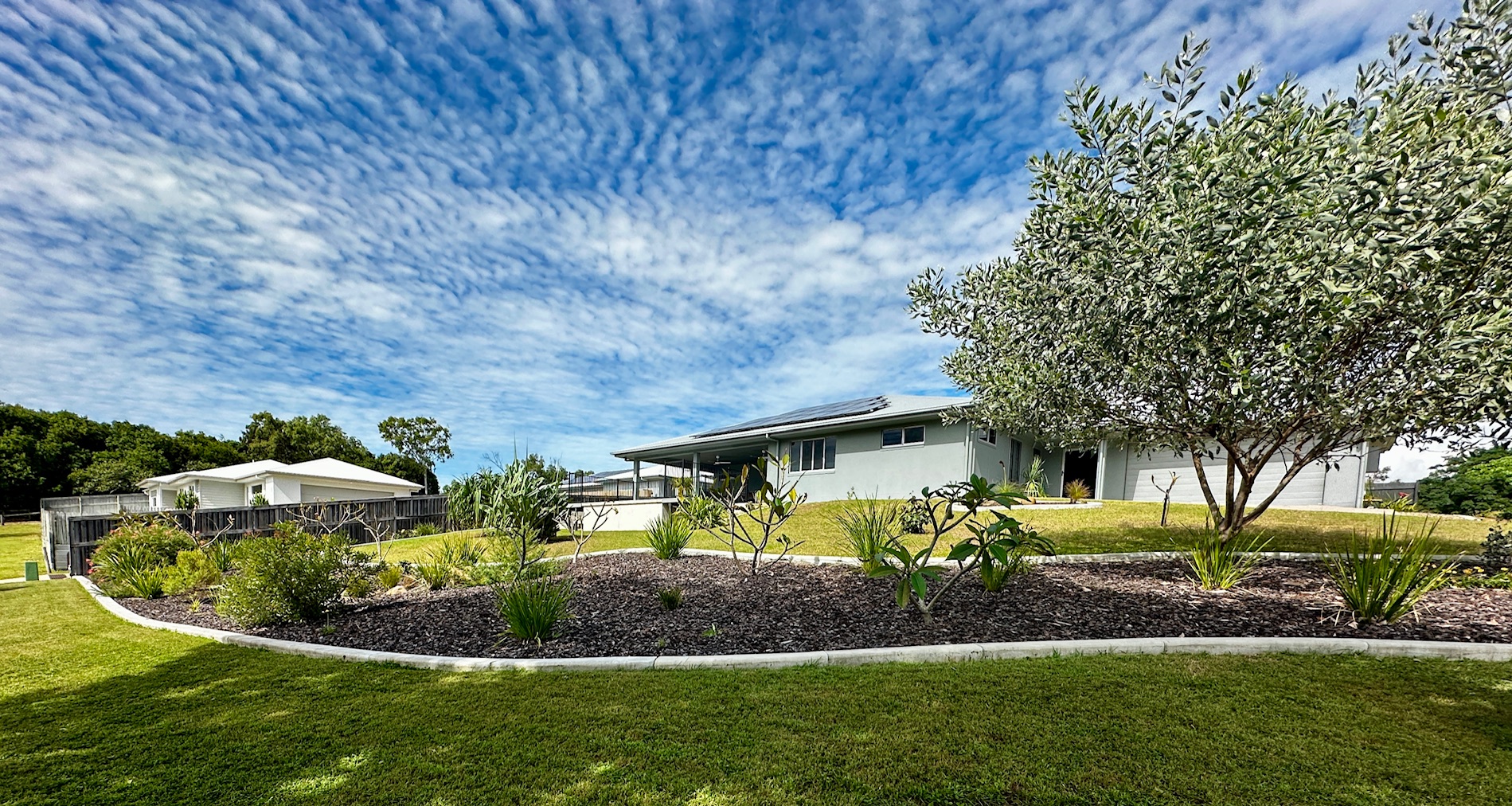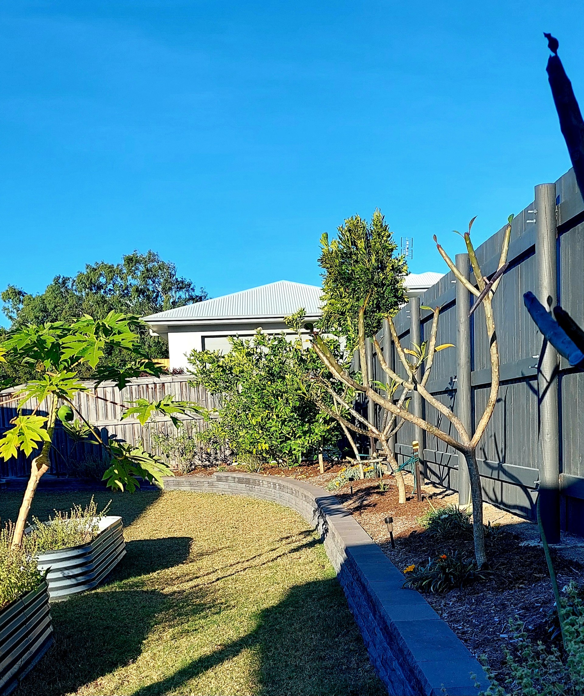 Established native gardens and fruit trees (lemon, lime, pawpaw) plus raised herb beds and room to expand for a larger shed, boat or caravan