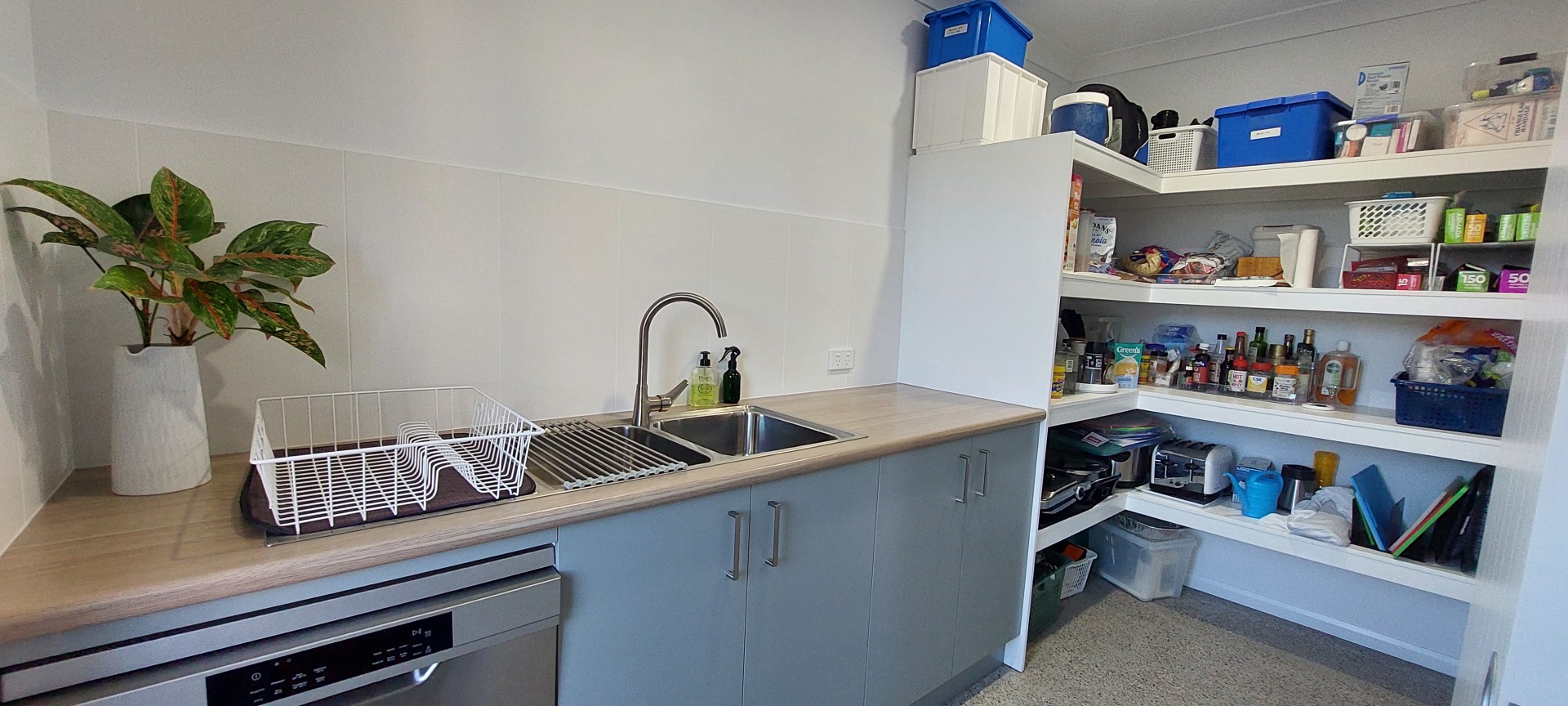 Modern kitchen with 2.5m Essastone island bench, induction cooktop, plumbed fridge space and walk-through butler's pantry