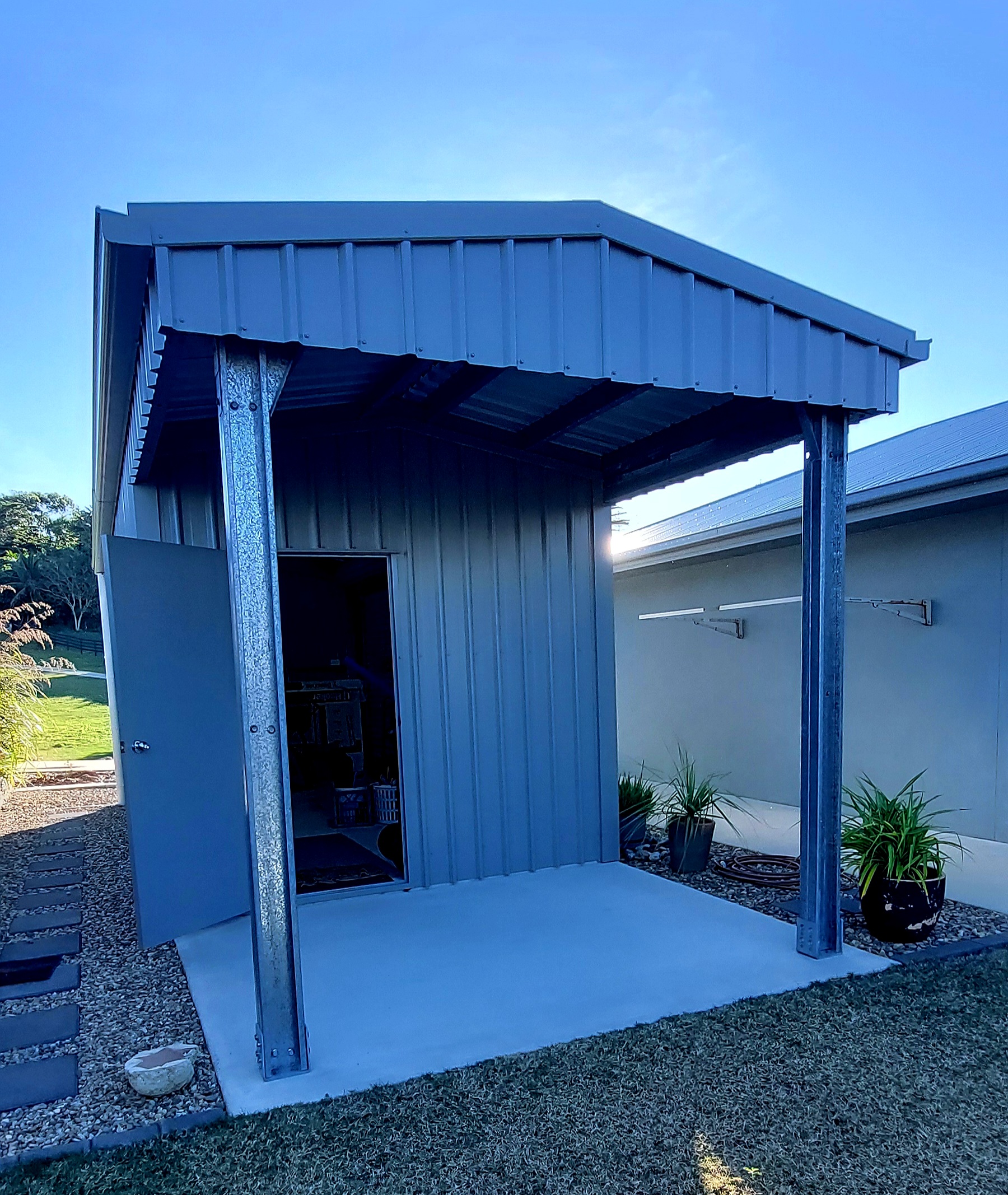 6m x 3m powered shed with an additional 2m x 3m covered patio and dual lockable access including a roller door