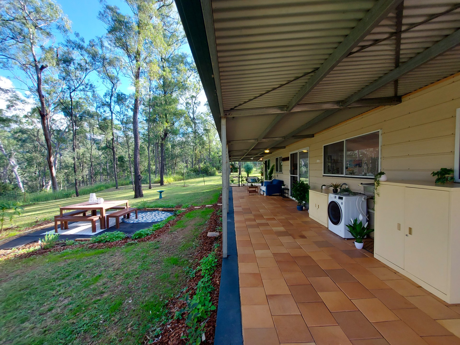 • Luscious soil with new easy irrigation for all gardens, which include banana plants, mulberries, grapes, blueberries, passionfruit, finger lime, pumpkins, flowers, many natives etc. 30 free plants from Ipswich Council every year included.