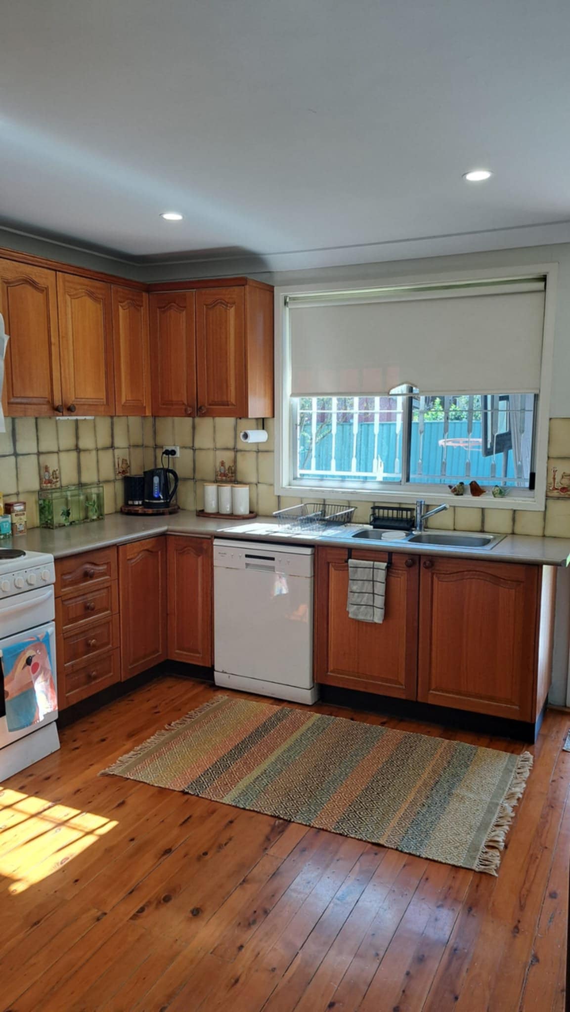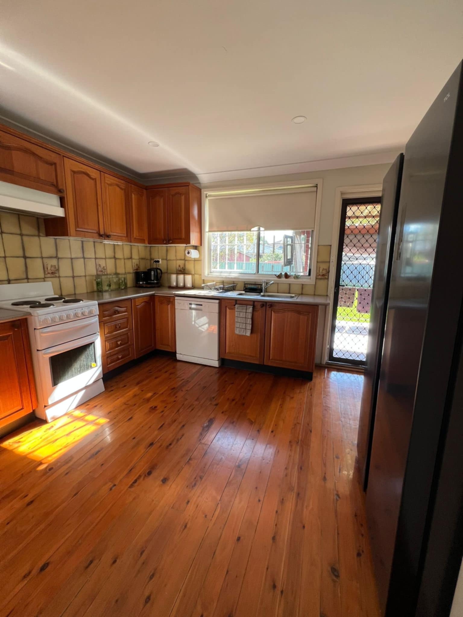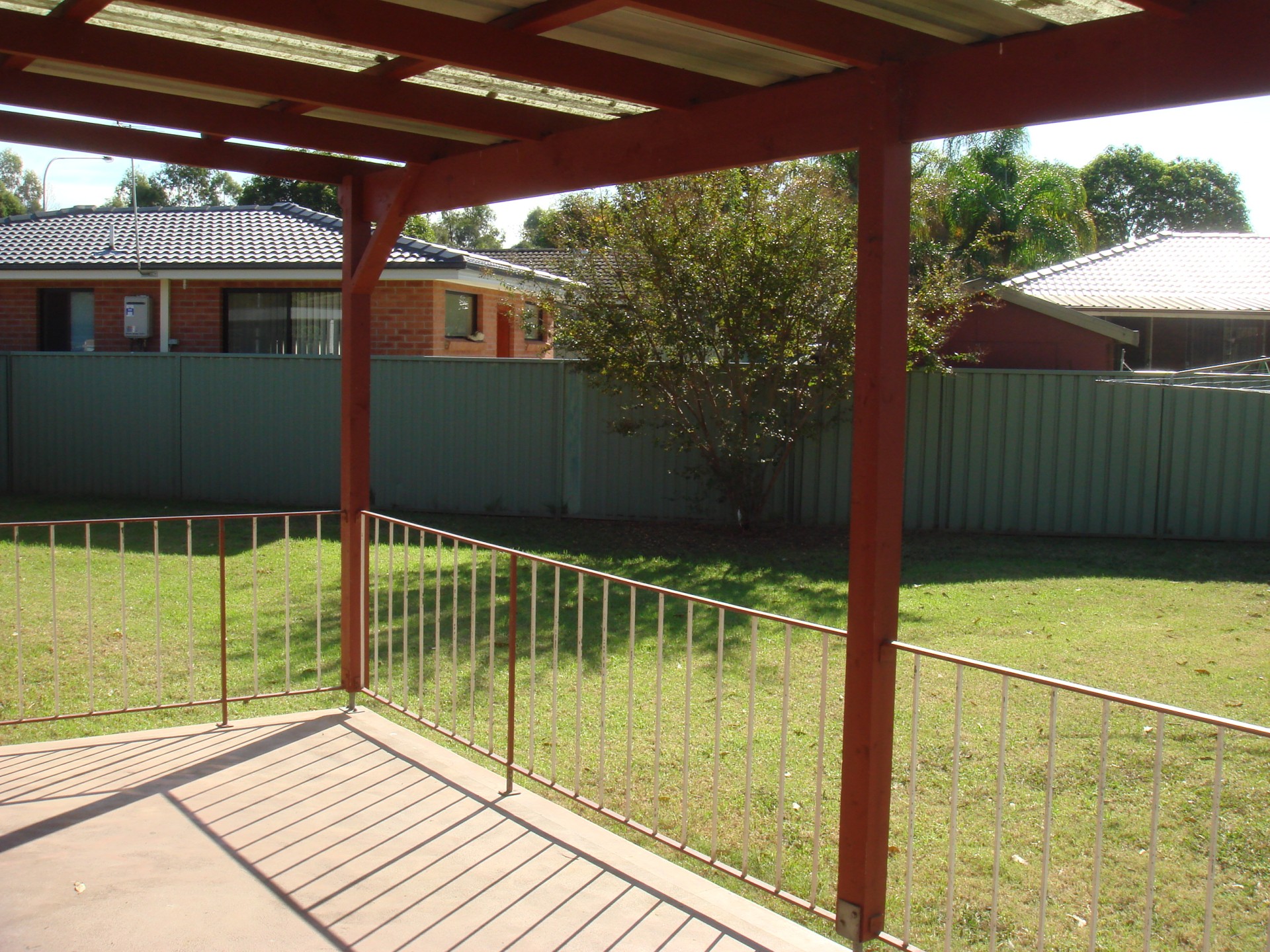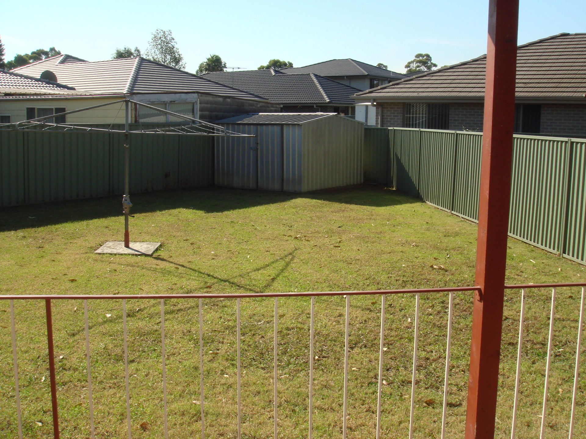 A big, flat backyard with 6 ft colourbond fence and a shed, and a re-furbished Council playground at the end of the street.