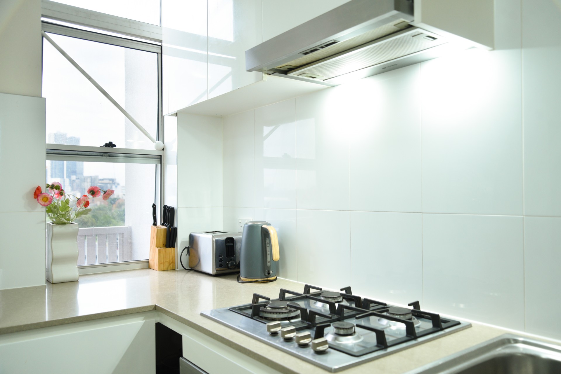 Modern kitchen with stone benchtops and stainless steel appliances