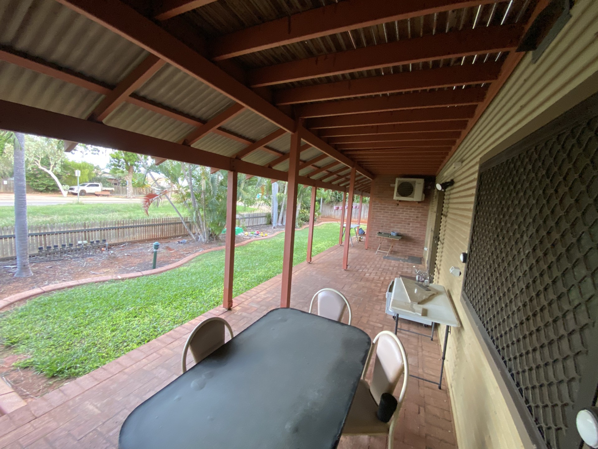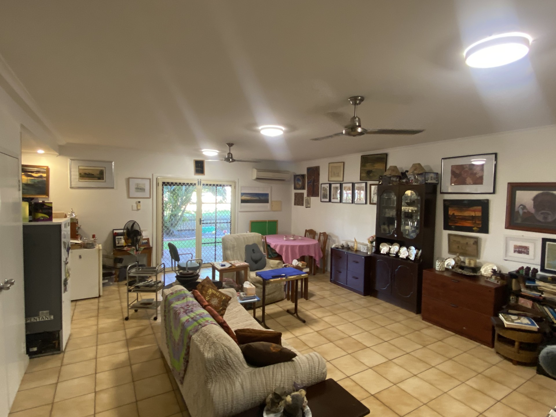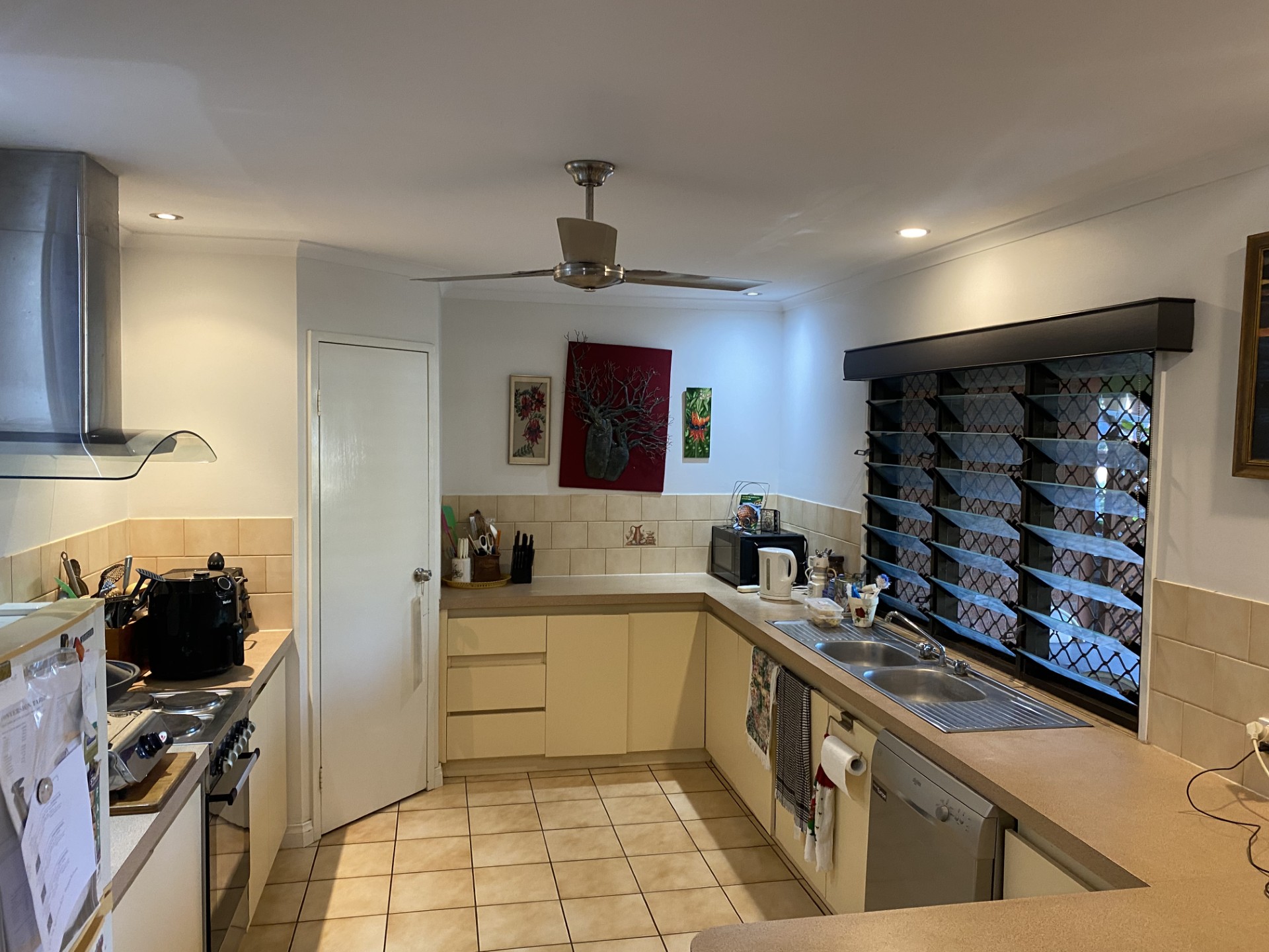 The tiled, airconditioned open plan living area is well laid out with large bifold doors opening out onto the outdoor patio making the most of the cool bay breezes. A generous, fully appointed galley style kitchen with electric stove, oven and range-hood flows well into the main living area with a louvered window view of patio and gardens.