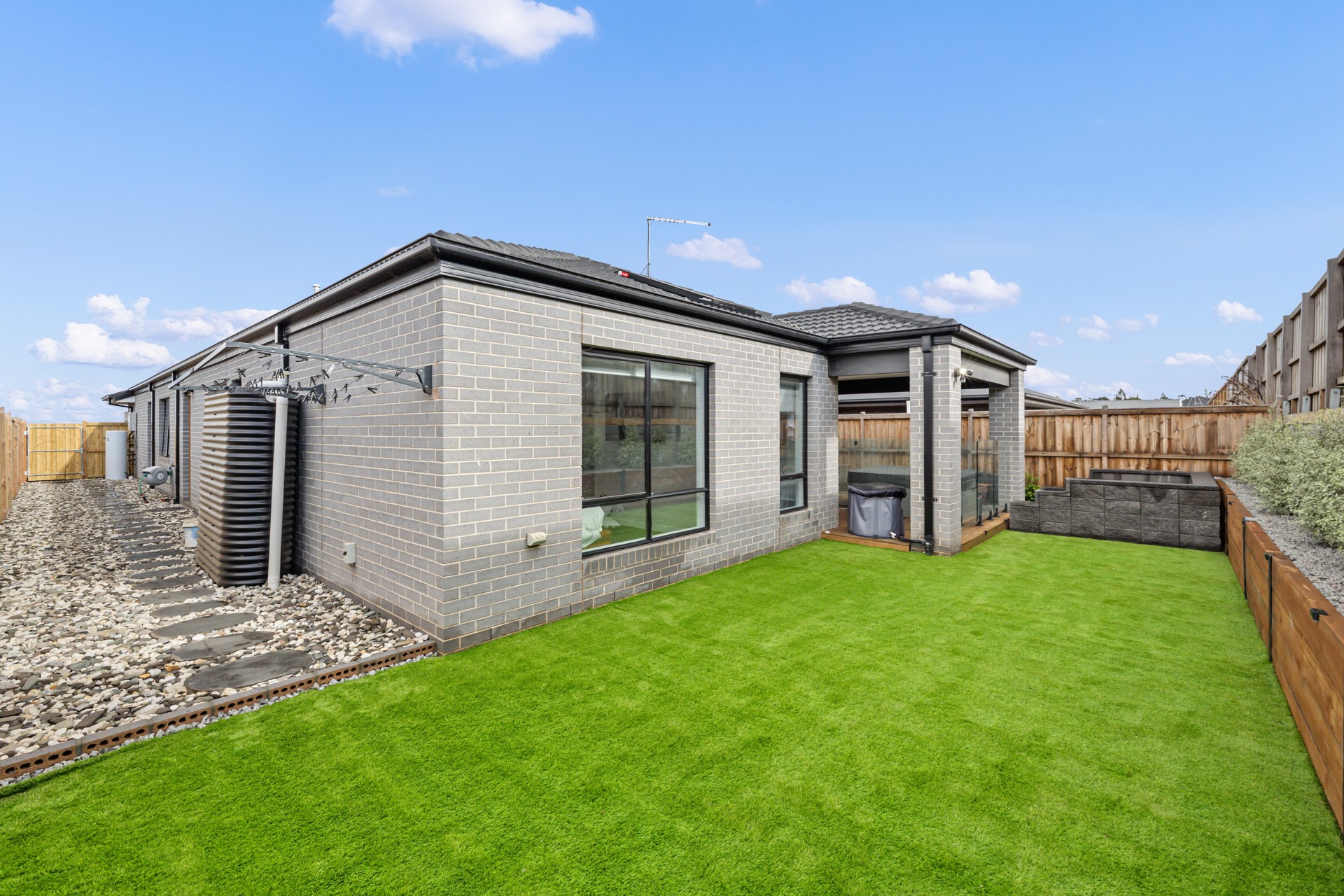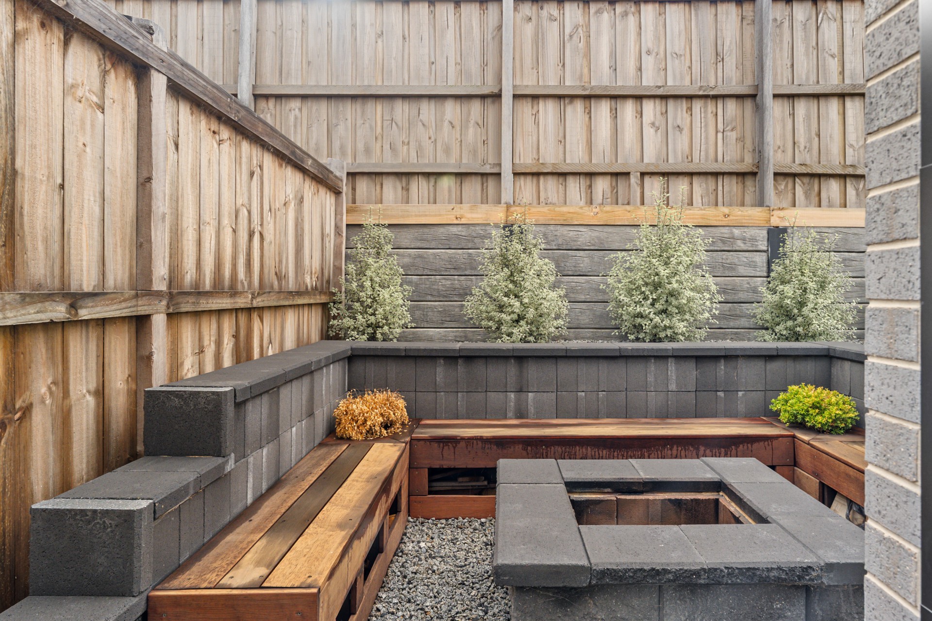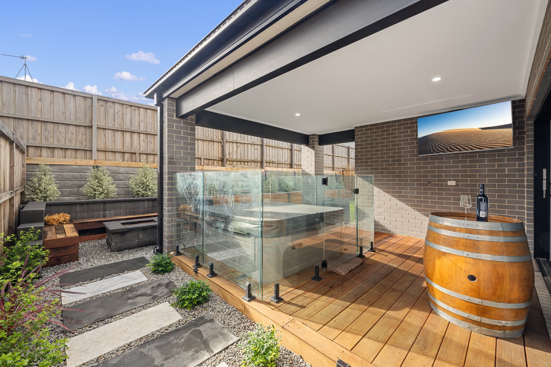 Step outside to a modest yet well-manicured landscaped garden area, a private alfresco, aboveground firepit and deck ready for barbecues, morning coffees, or relaxed evenings under the stars.