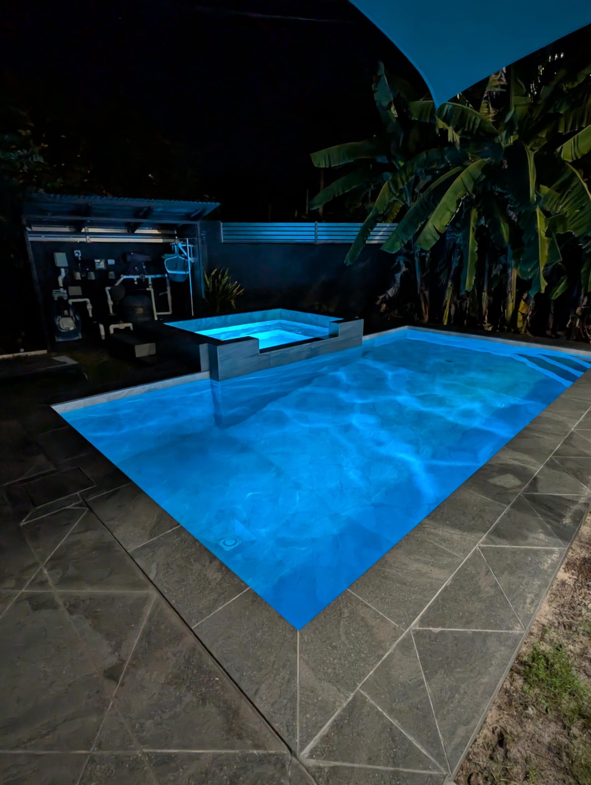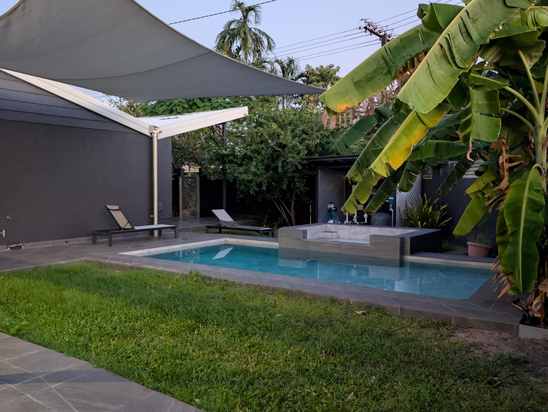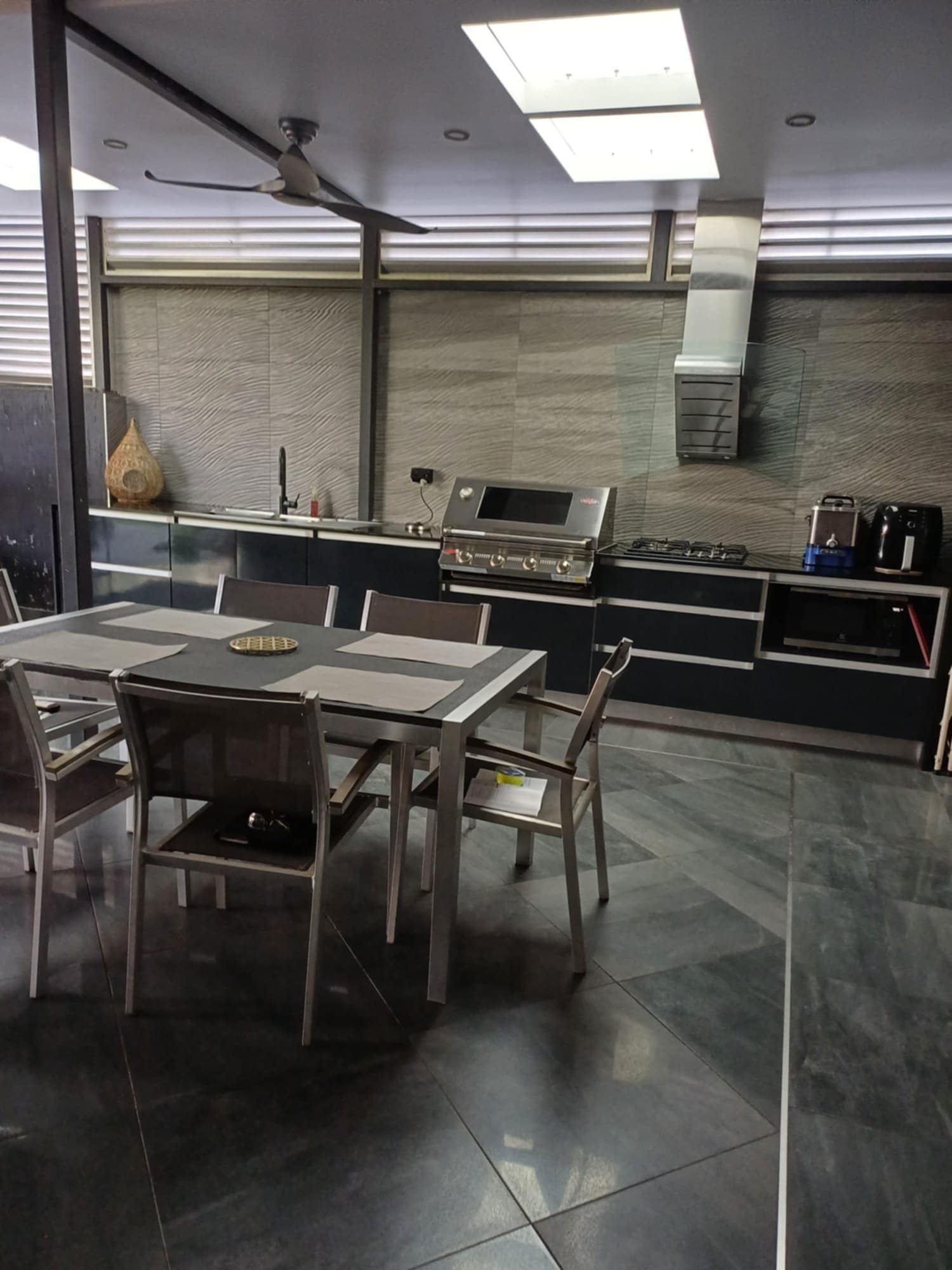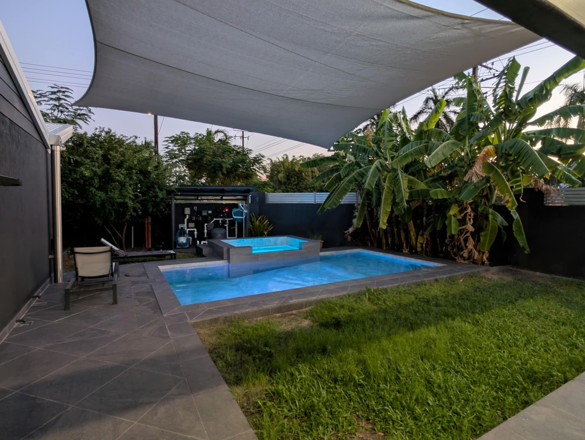 Mineral pool + jacuzzi, several storage areas, outdoor kitchen, double entry, solar panels, DC ceiling fans.