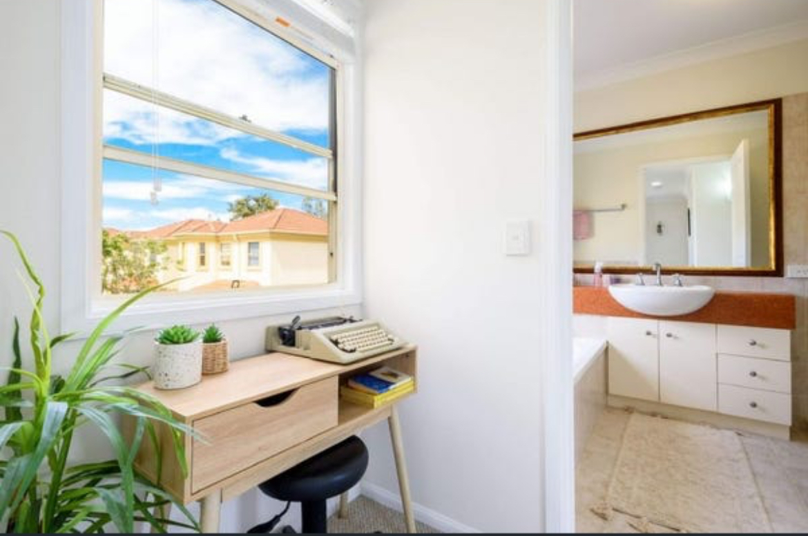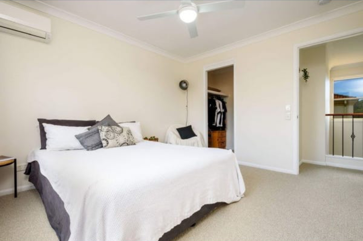 The master bedroom, with its king size dimensions, features a dual walk through robe, air conditioning, ceiling fan, and an ensuite bathroom, offering a luxurious retreat. The additional two queen sized bedrooms come equipped with ceiling fans and built in wardrobes, while a handy study nook completes the upstairs layout.
