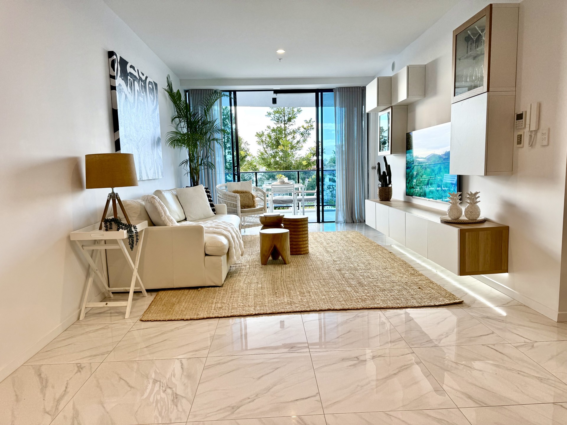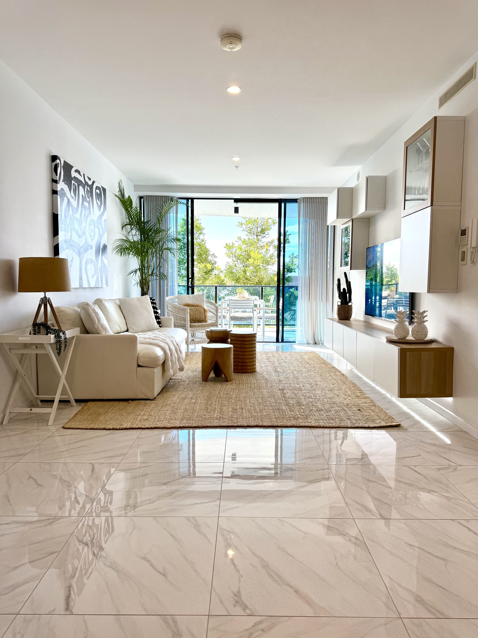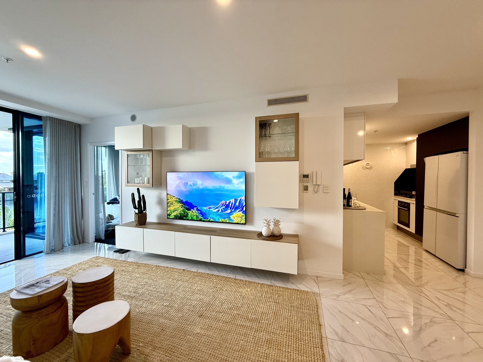 The spacious light filled open planned living and dining areas leading through glass sliding doors to the gorgeous balcony overlooking a huge expanse of water. The living room provides high end storage space with floating cocktail cabinetry which further enhances this sophisticated space.