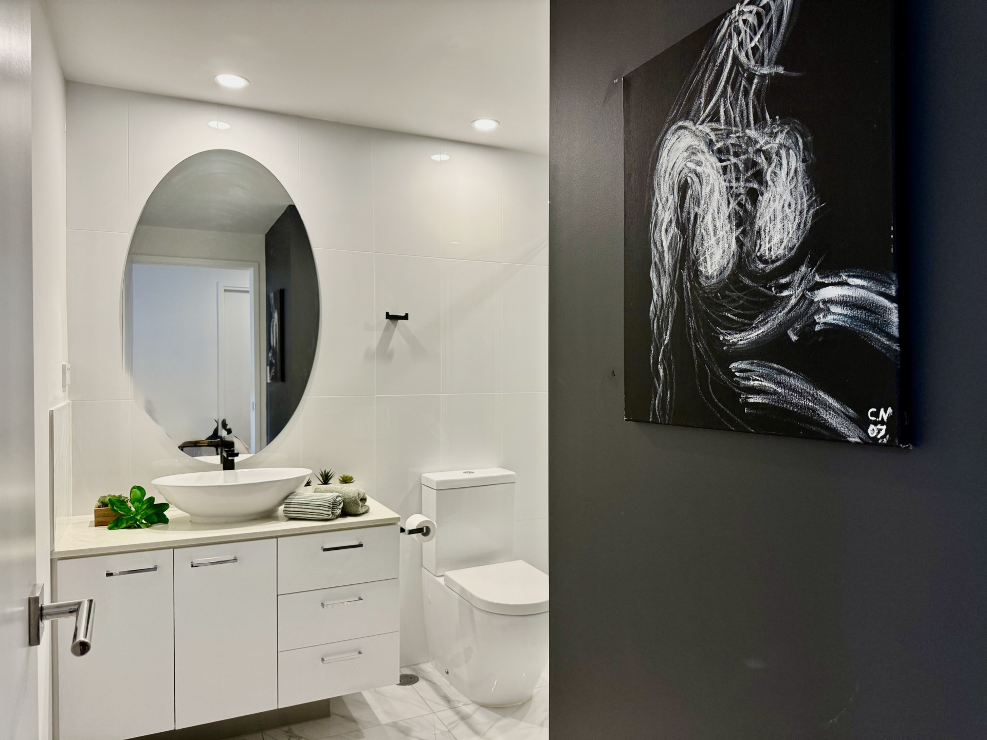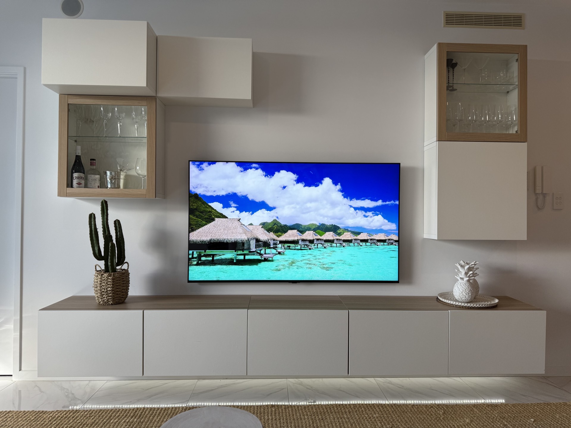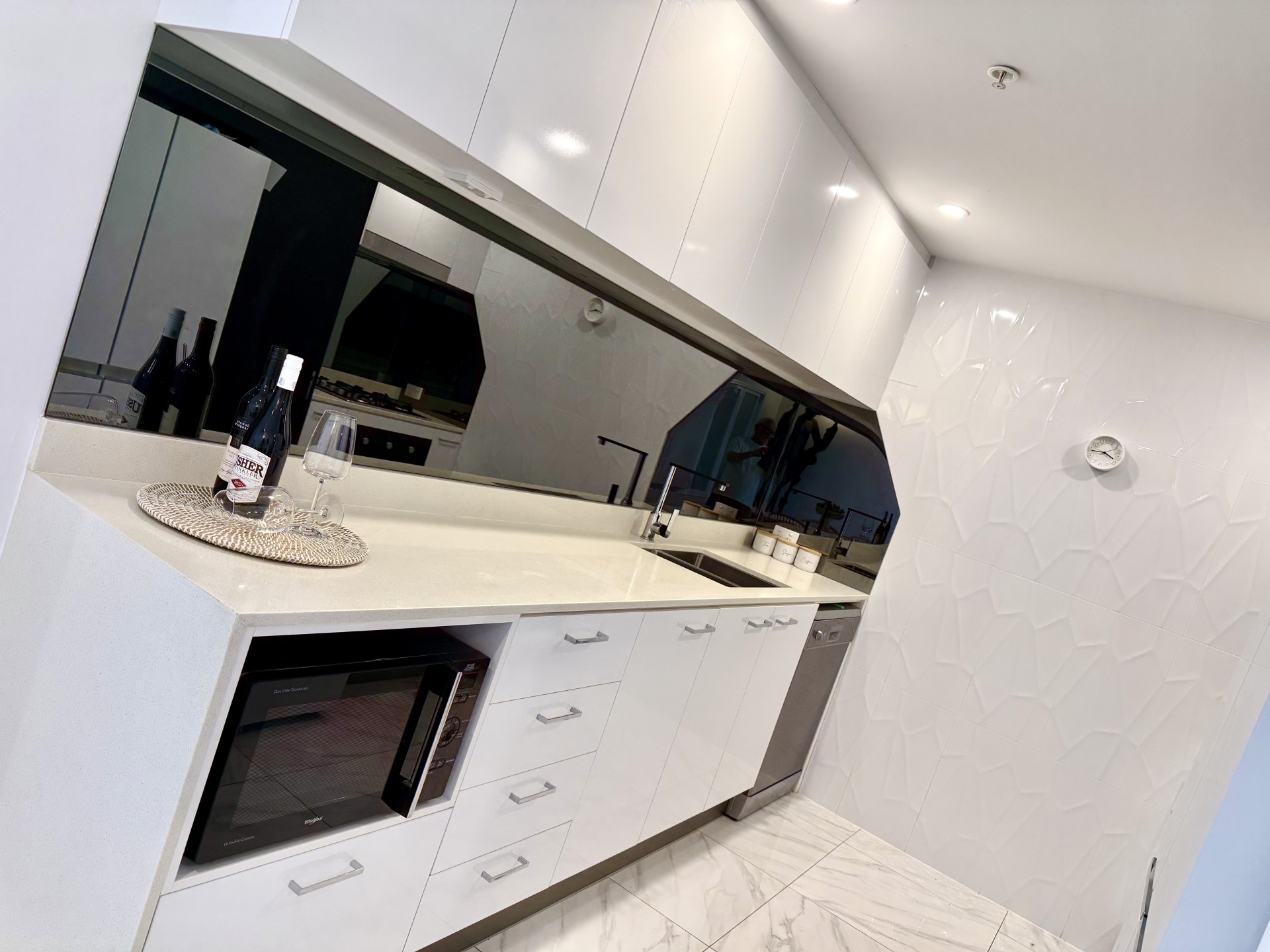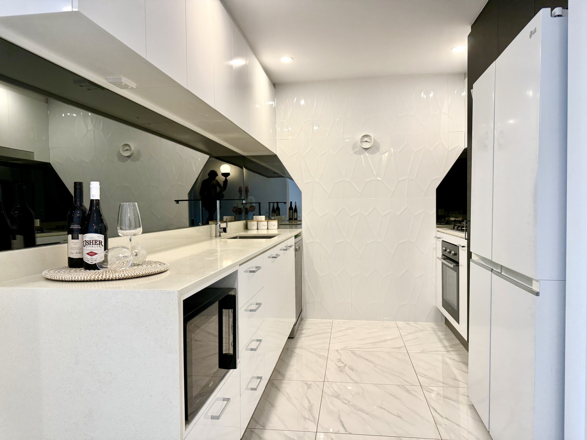 The spacious light filled open planned living and dining areas leading through glass sliding doors to the gorgeous balcony overlooking a huge expanse of water. The living room provides high end storage space with floating cocktail cabinetry which further enhances this sophisticated space.