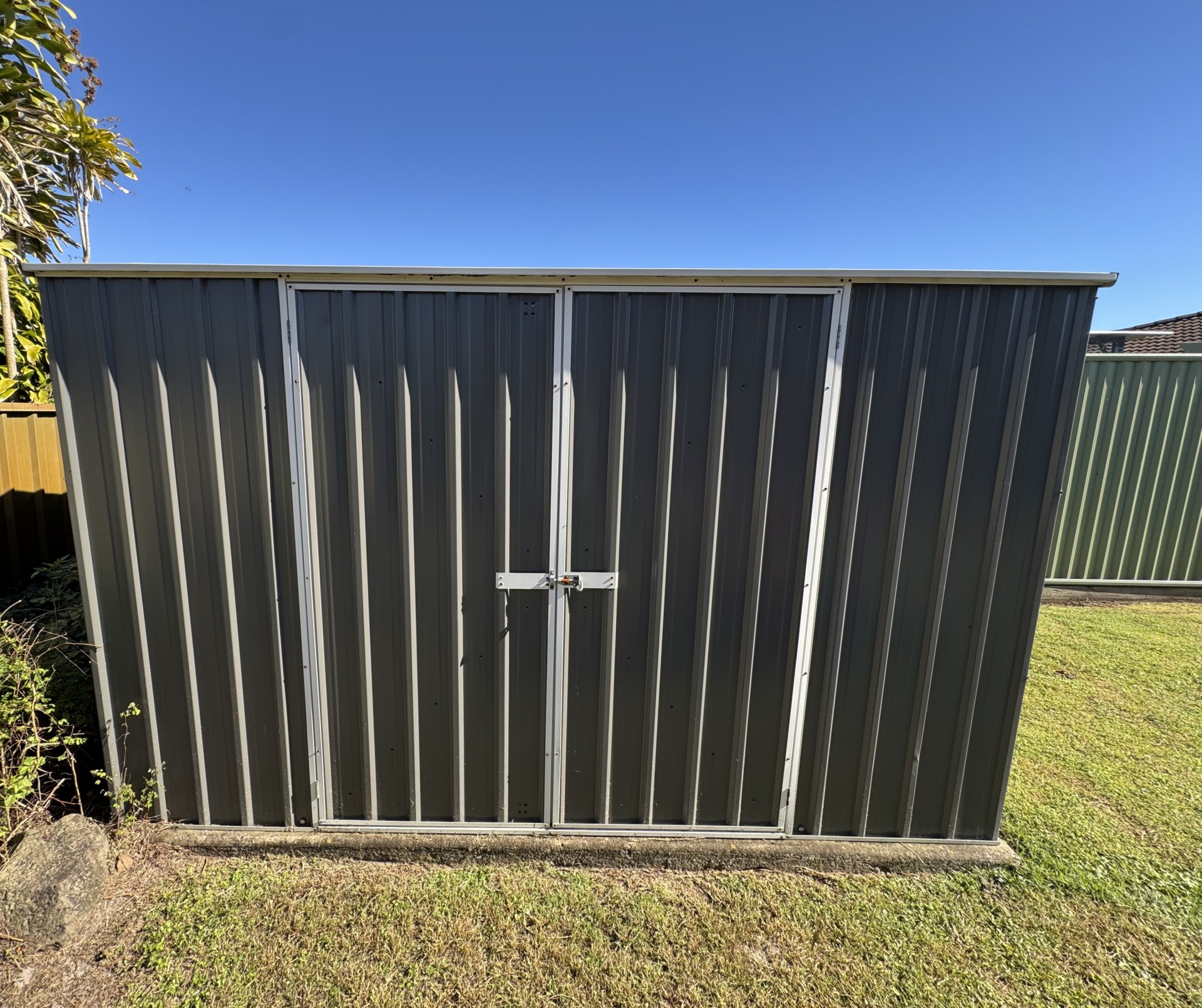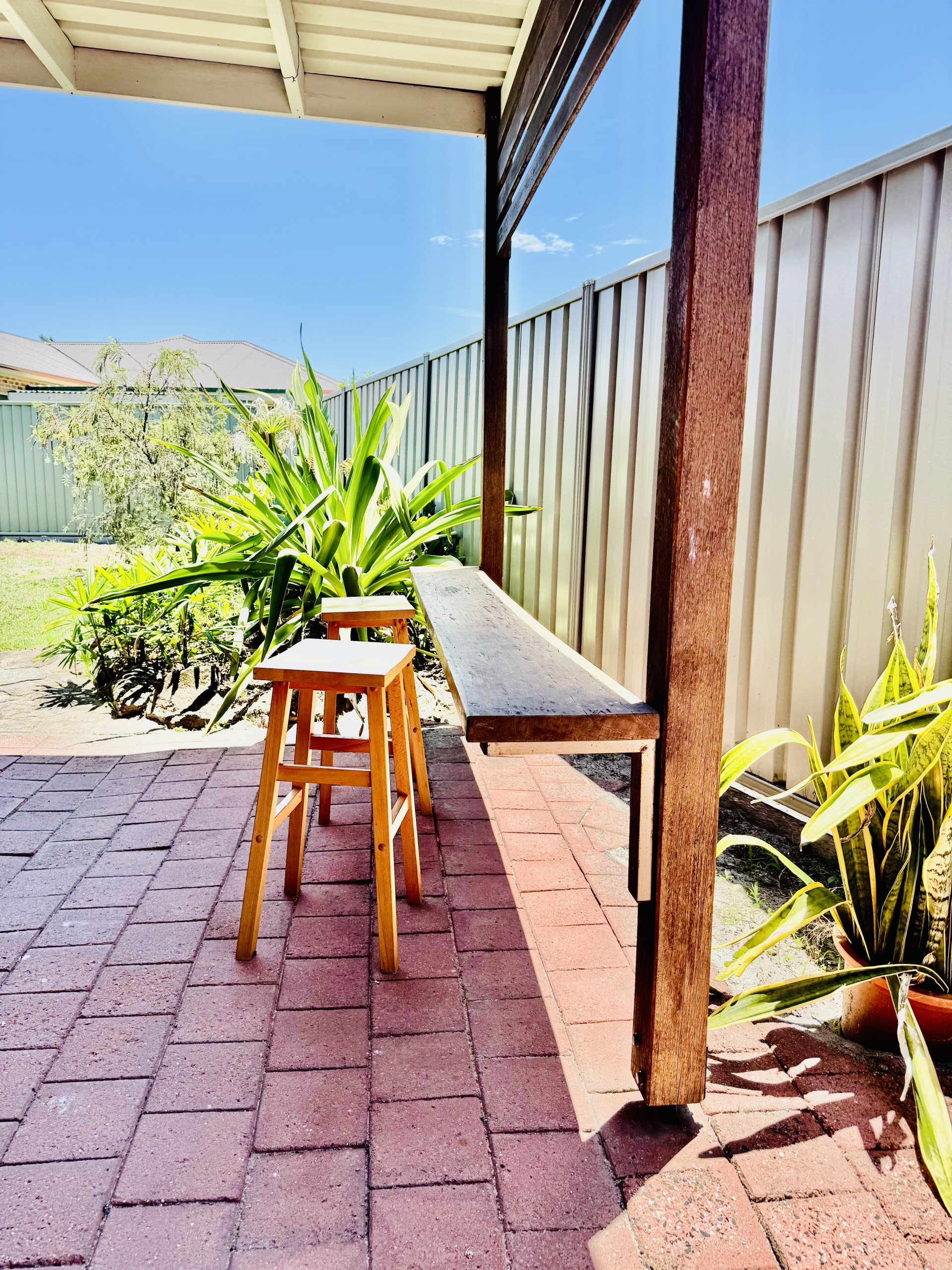 The low maintenance backyard includes a large garden shed, and an outdoor sunlit covered patio, with enough space to add a pool