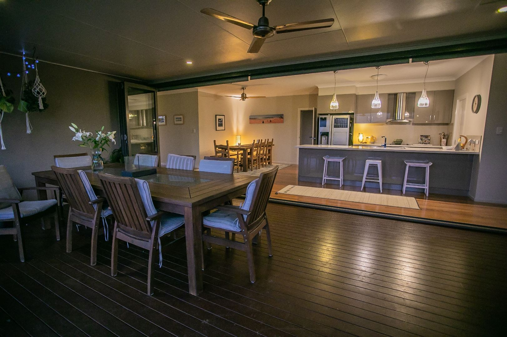* North eastern timber underroof entertaining deck with pull down gauze blinds and doors