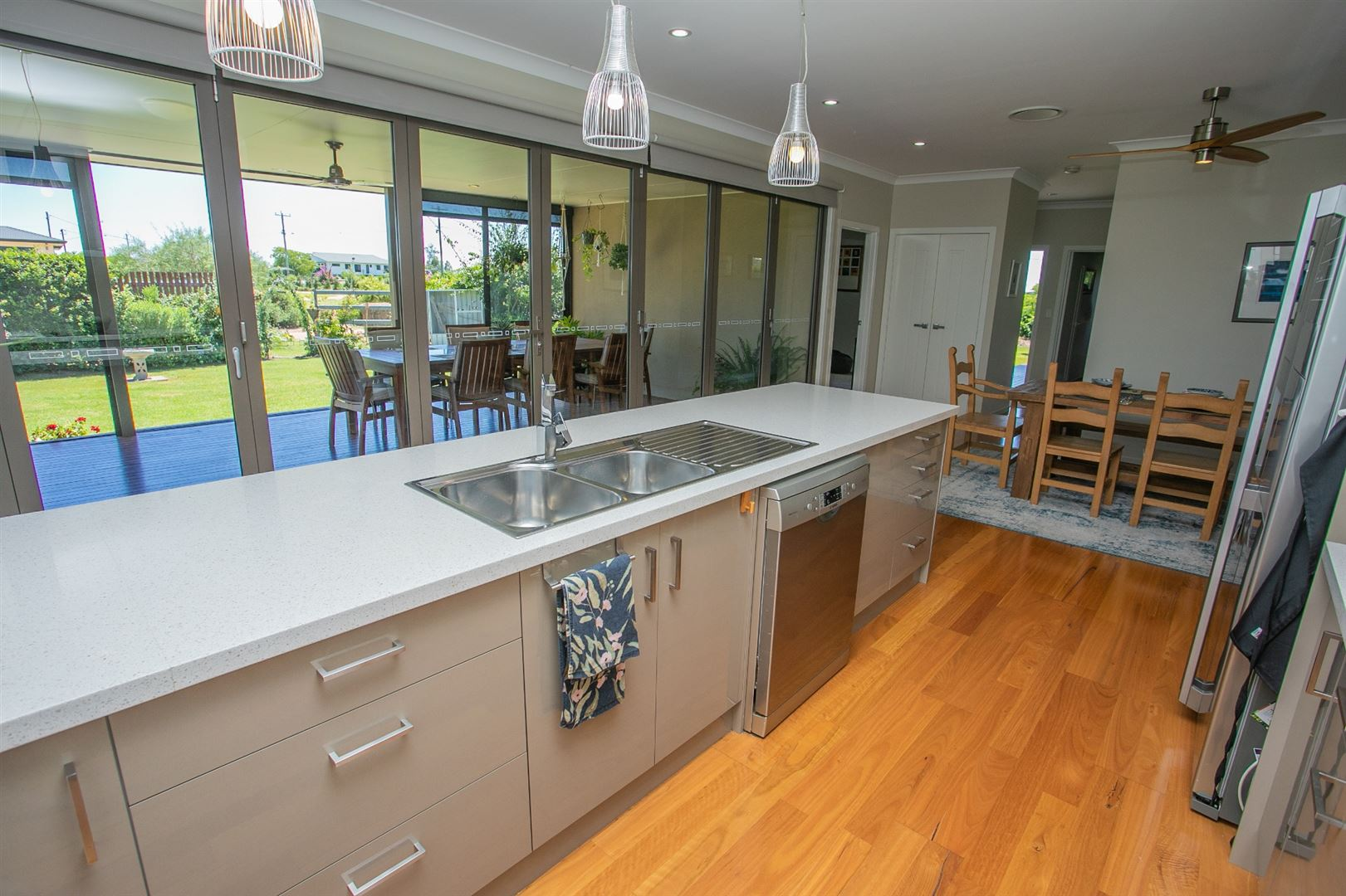 * Combined kitchen and dining area which opens through stacker doors onto the gauzed under roof patio area