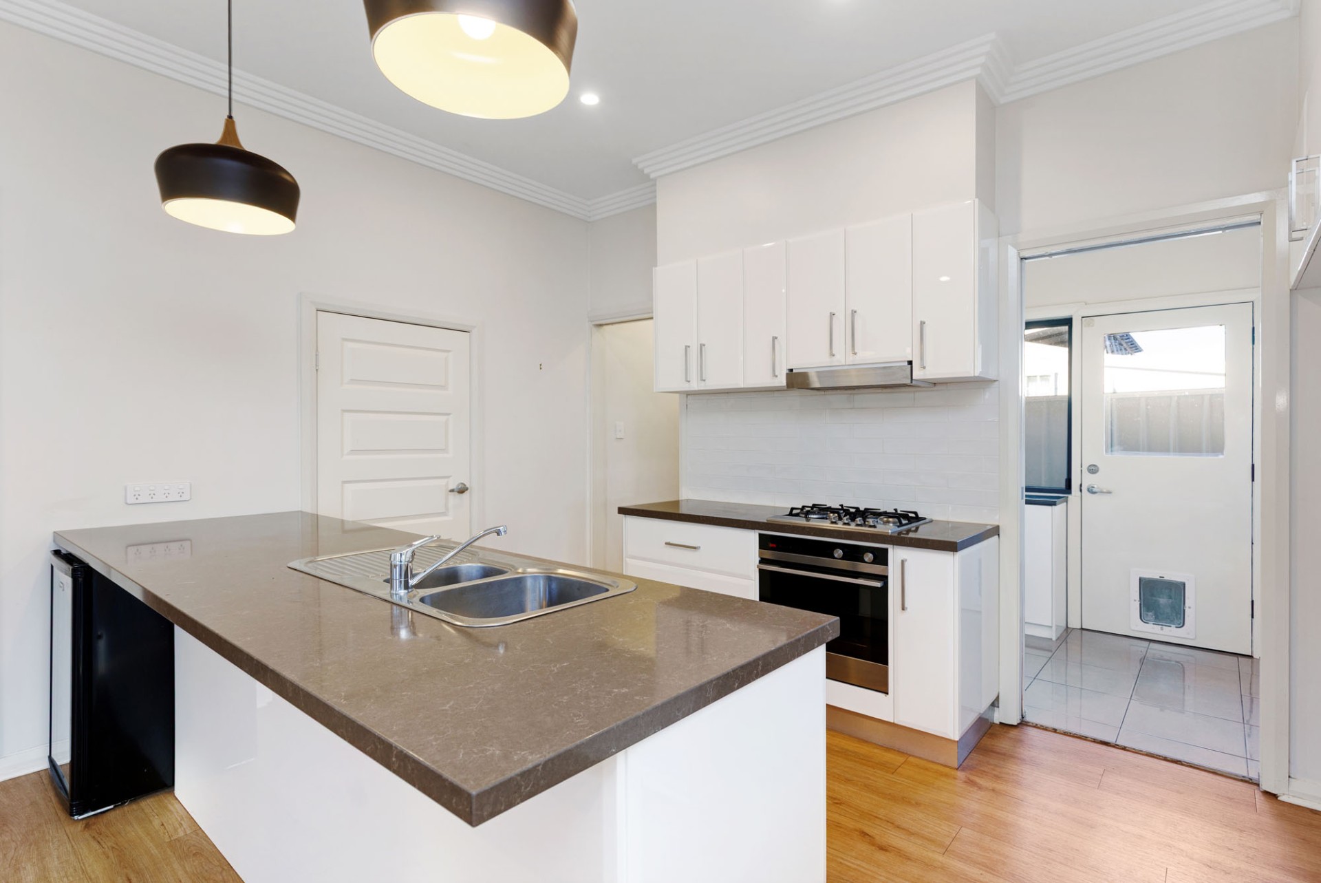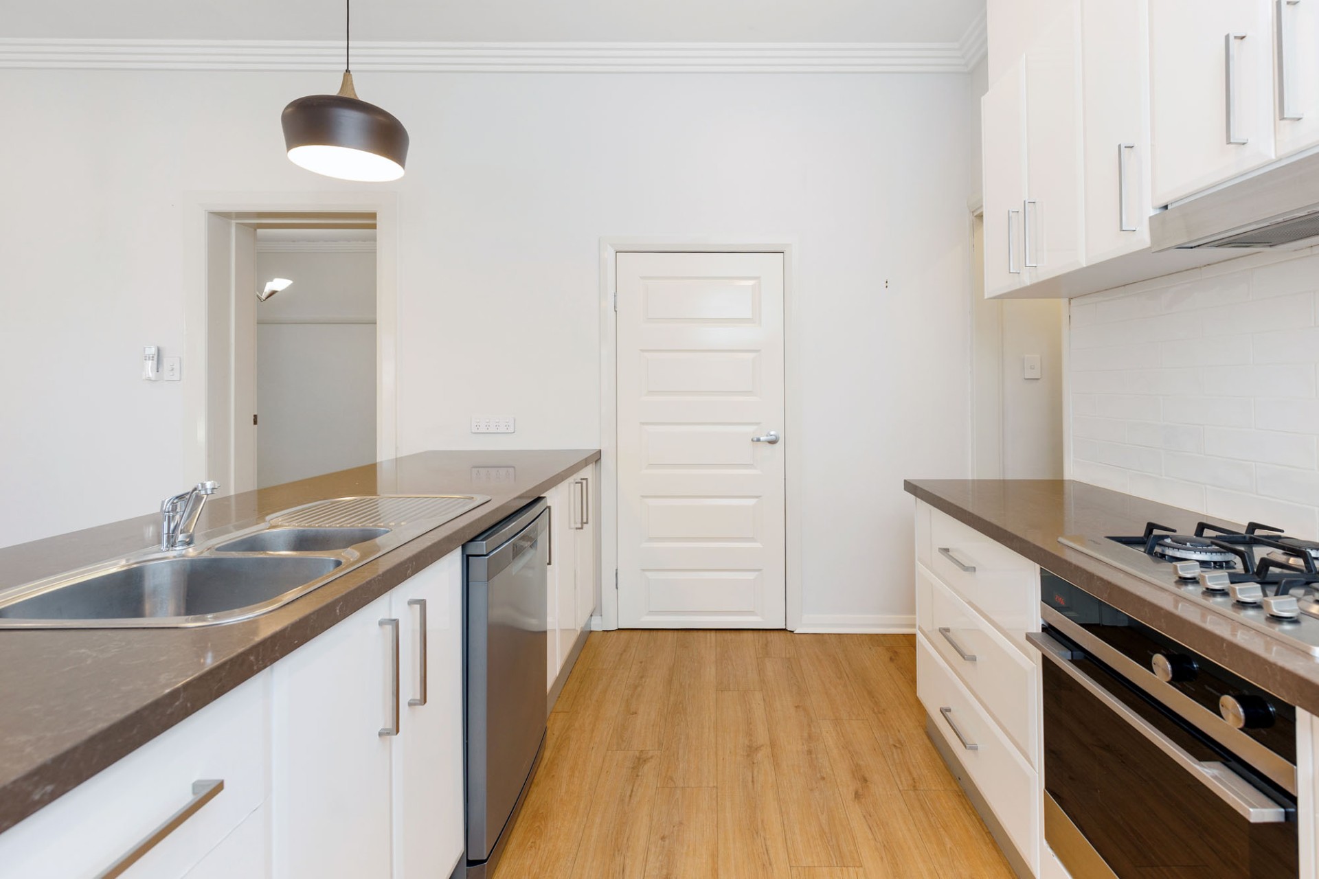 Modern kitchen with stone bench-tops, dishwasher, and gas cooking