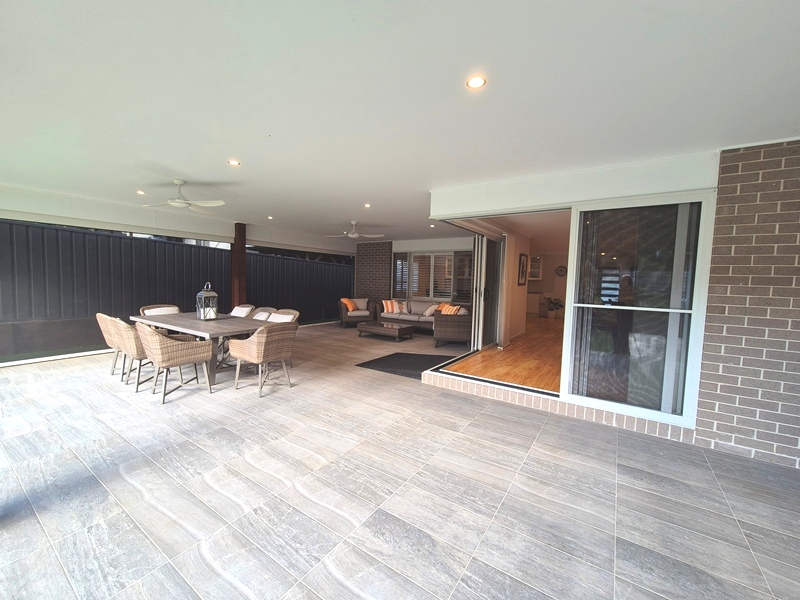 The 52m2 spacious outdoor entertaining/alfresco dining area has been beautifully tiled, in this area there are remote controlled floor to ceiling blinds/screens providing a totally private space, night or day, whatever the weather and without the creepy crawlies!