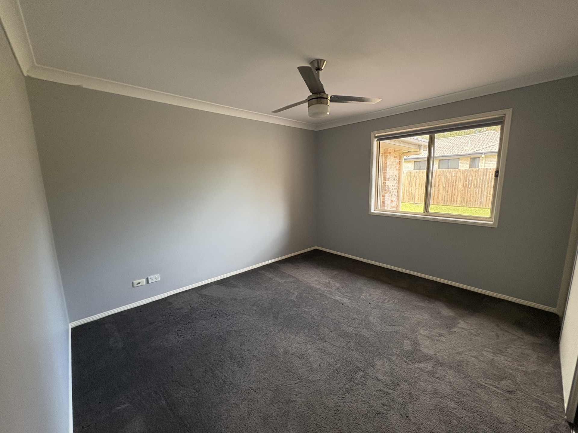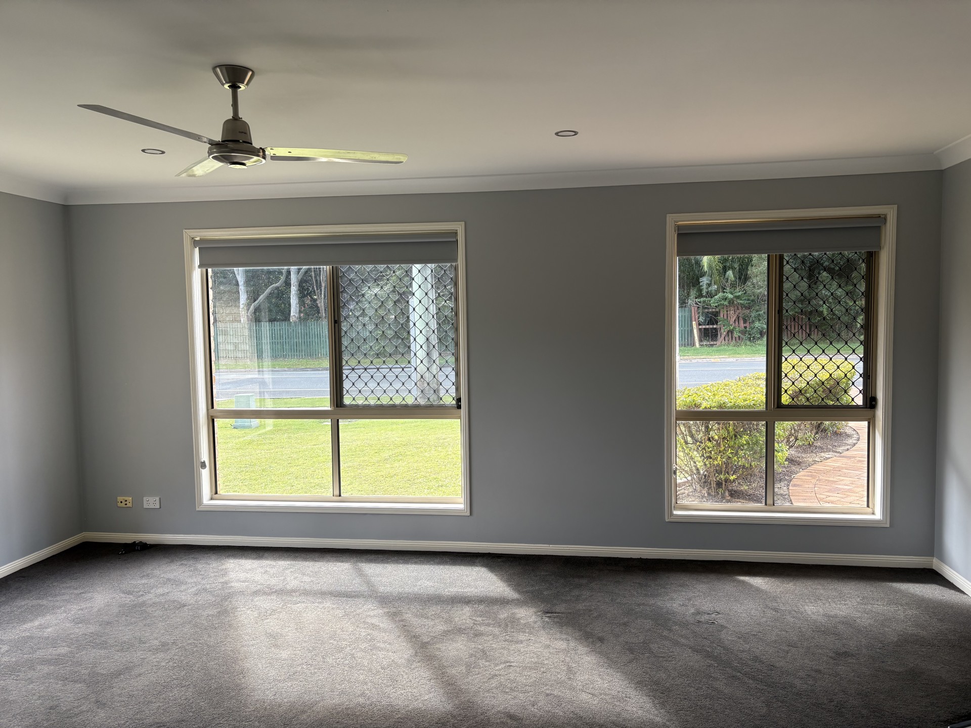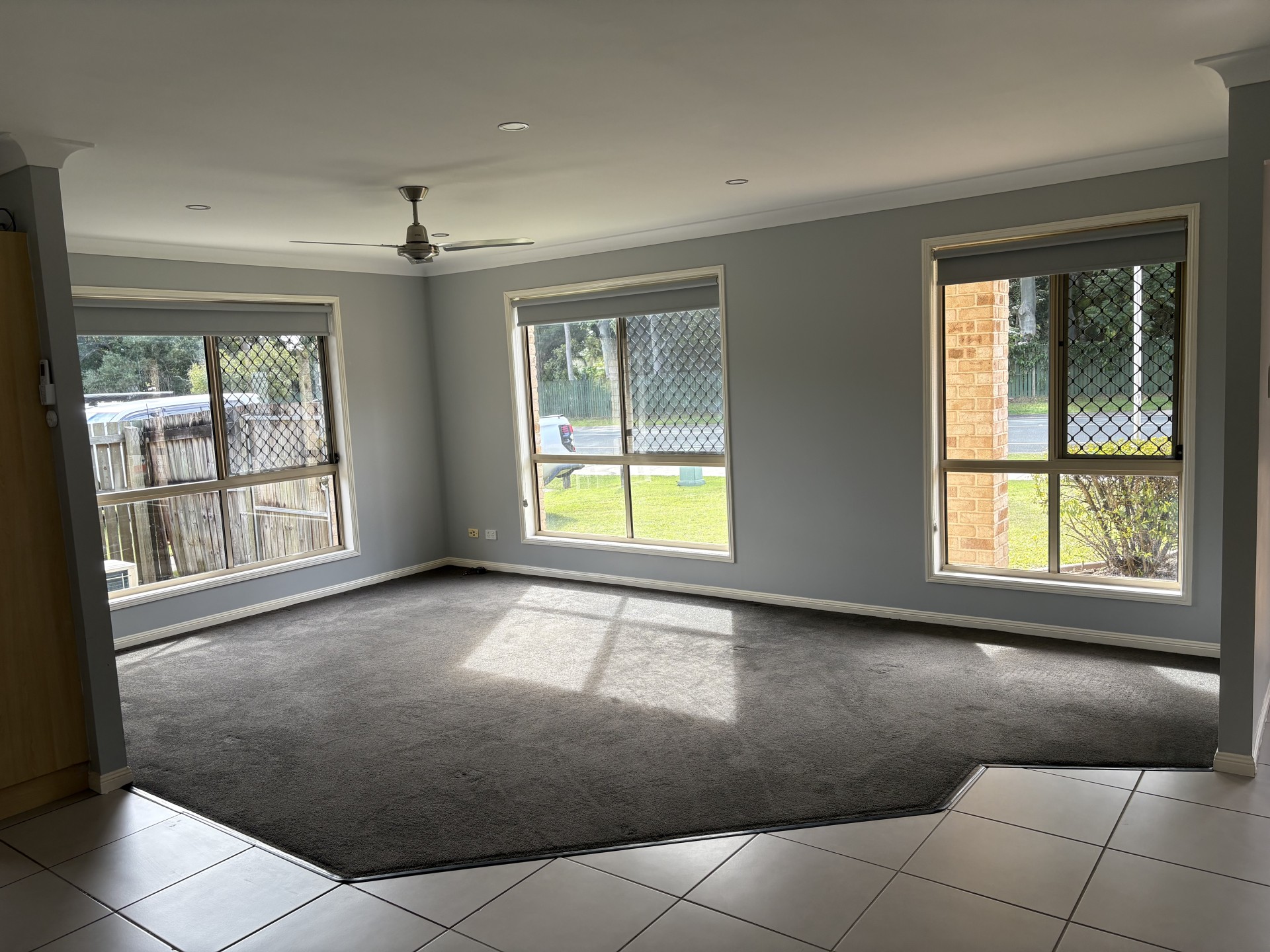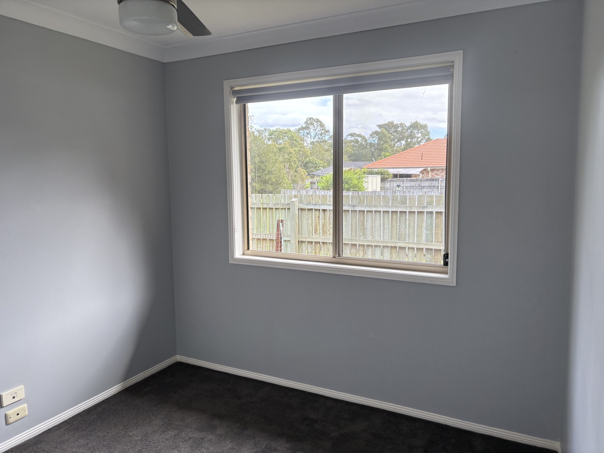 The 2 other bedrooms have the same plush carpet, second bedroom also has a large built-in 3-door wardrobe. The house has been recently repainted in a soft grey with block-out roller blinds and fans throughout.