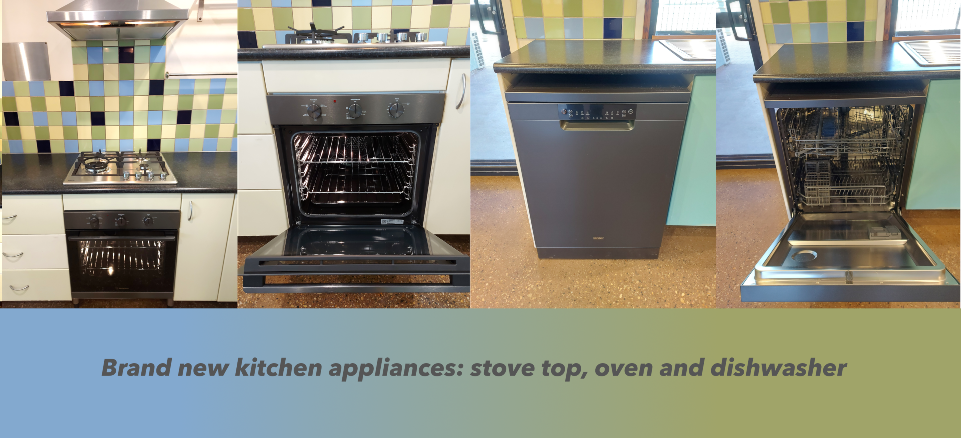 Brand new appliances in the spacious kitchen including oven, stovetop, and dishwasher.