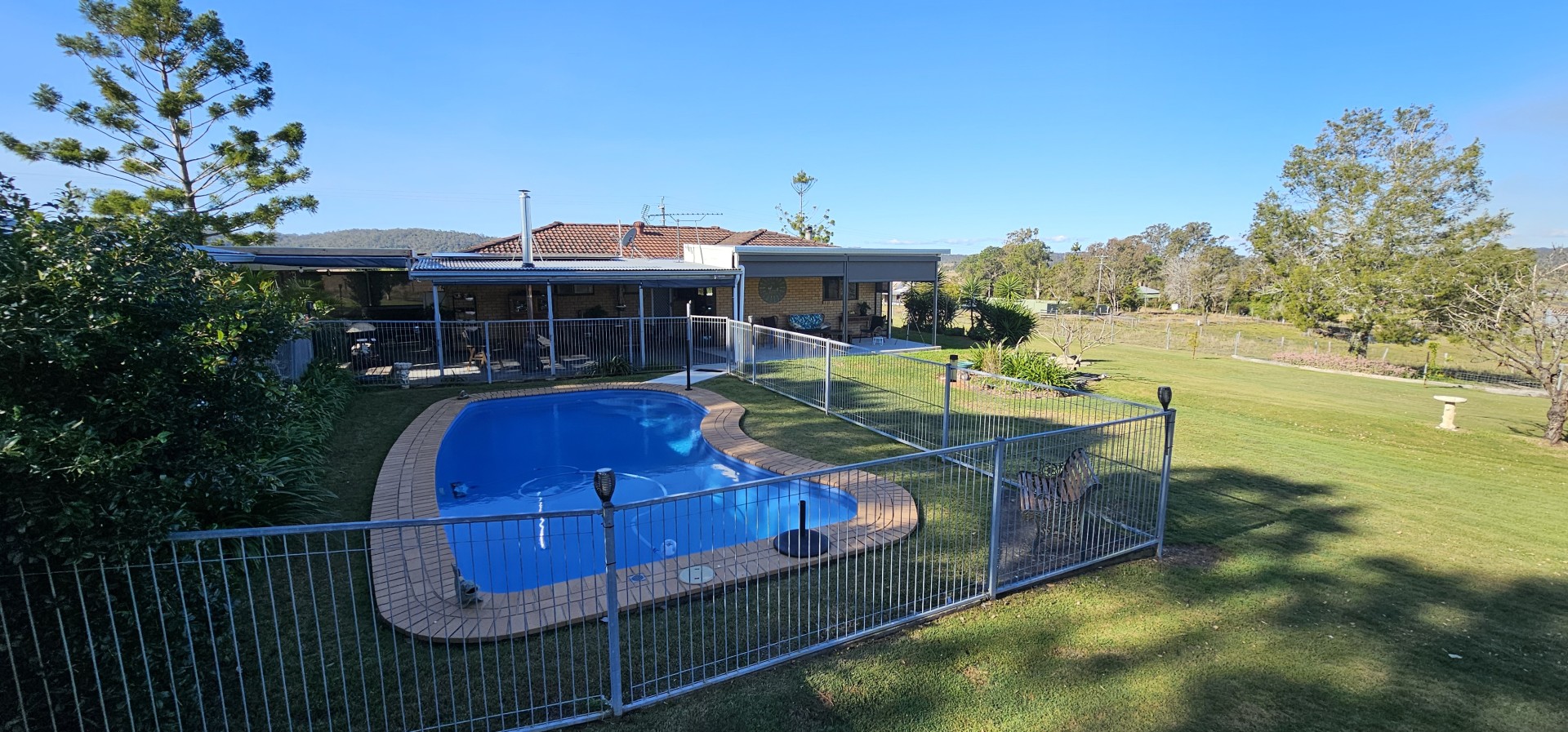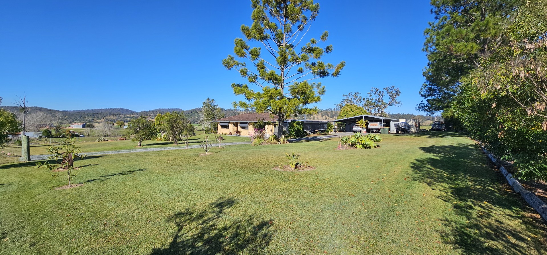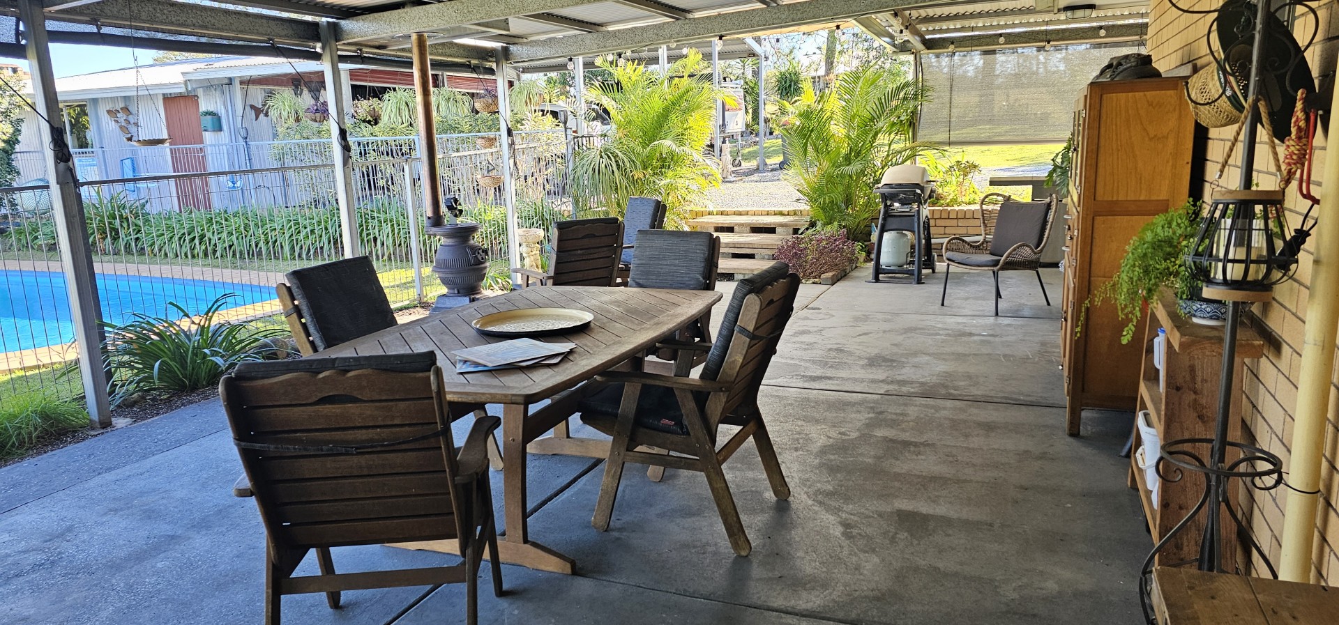 The newly fenced, elevated, flood free block of 4000 square metres is surrounded by farmland and with no close neighbours. This private landscaped oasis boasts an inground salt water pool and beautiful gardens with a variety of trees including a large Mango, Black Sapote, Lemon, Lime, Lemon Myrtle, Grevilleas, Callistemons, Hibiscus and Frangipanis, plus a veggie patch.