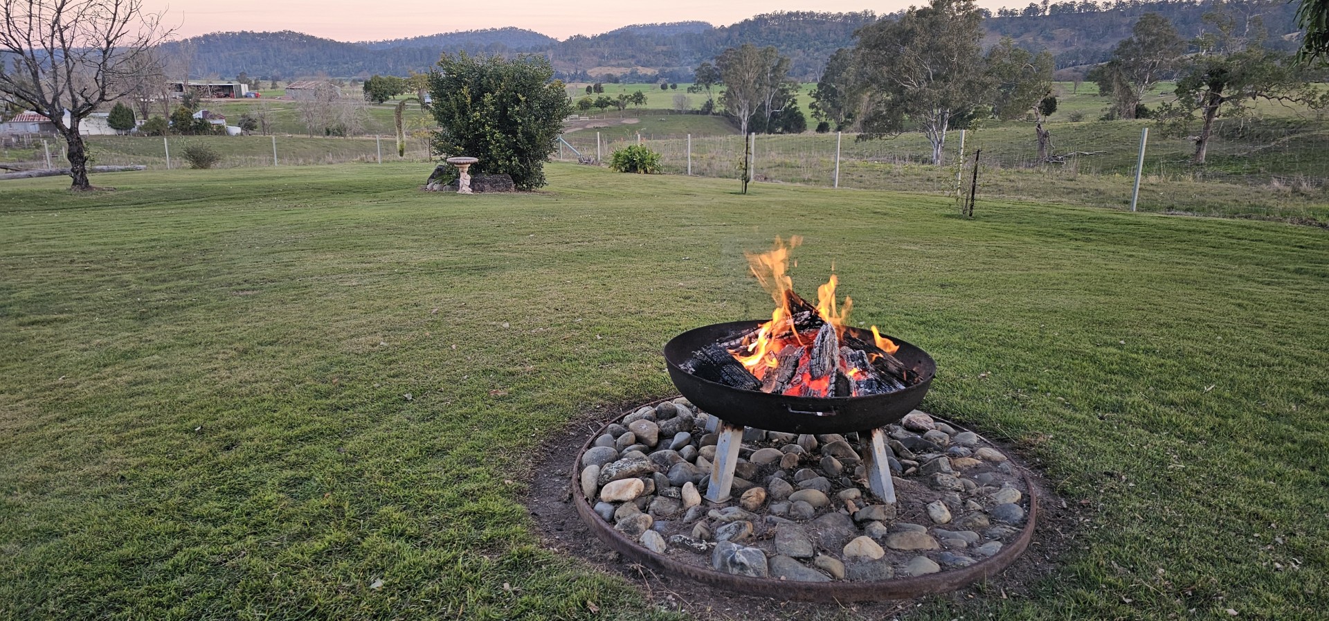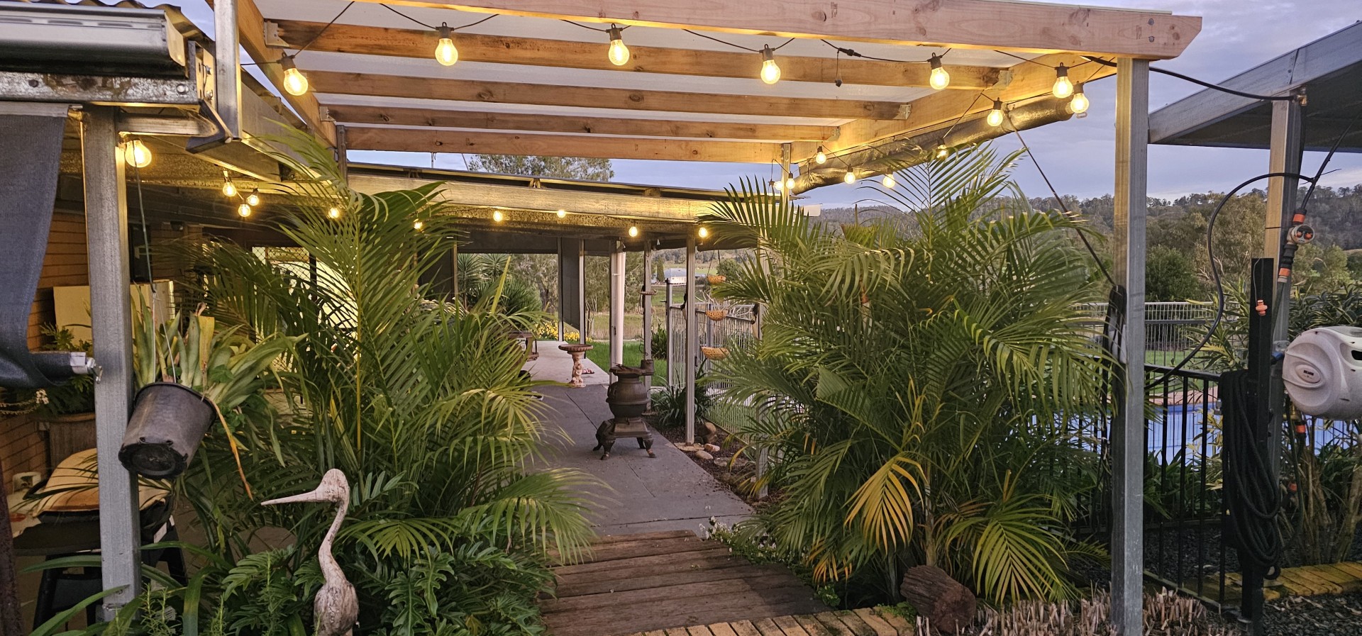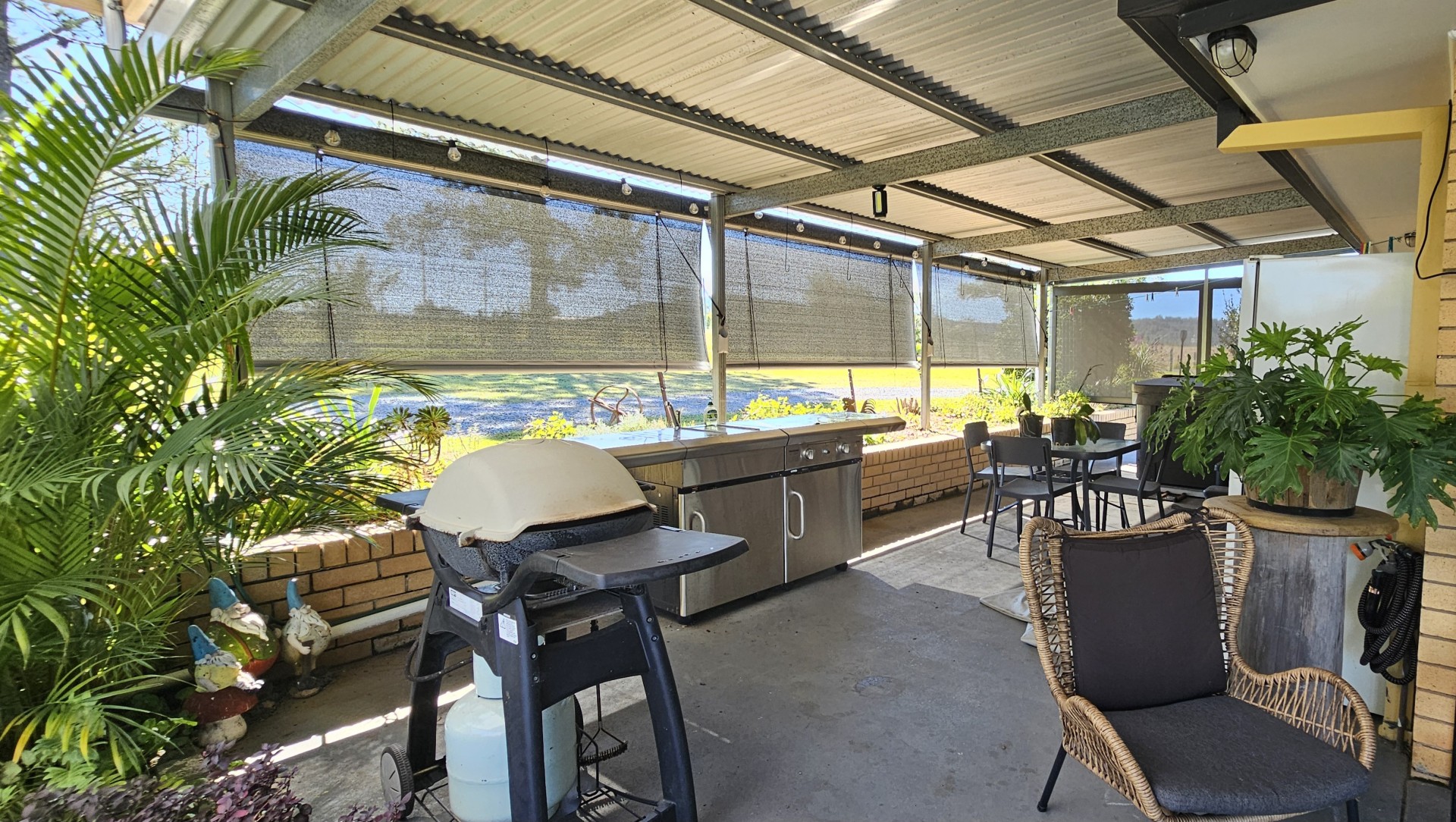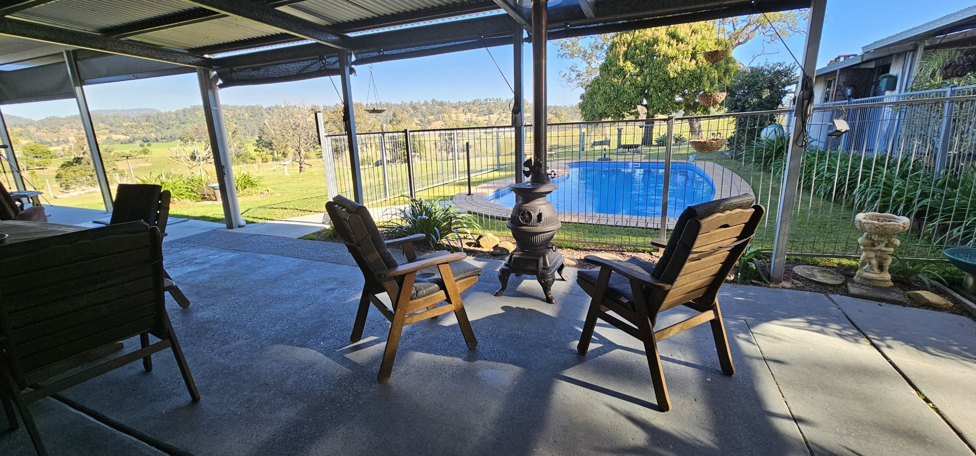 At the rear of the home is a huge 108 square meter outdoor entertaining area overlooking the salt water pool, firepit area and the valley beyond. With concrete floors plus a Pot Belly stove for those cooler evenings, there are zip and roller screens for shade in the warmer months too of course. A perfect setting for that morning cuppa or perhaps afternoon chilled drink. Simply relax and enjoy or perhaps get the barbie ready for tea as you enjoy the sunset.