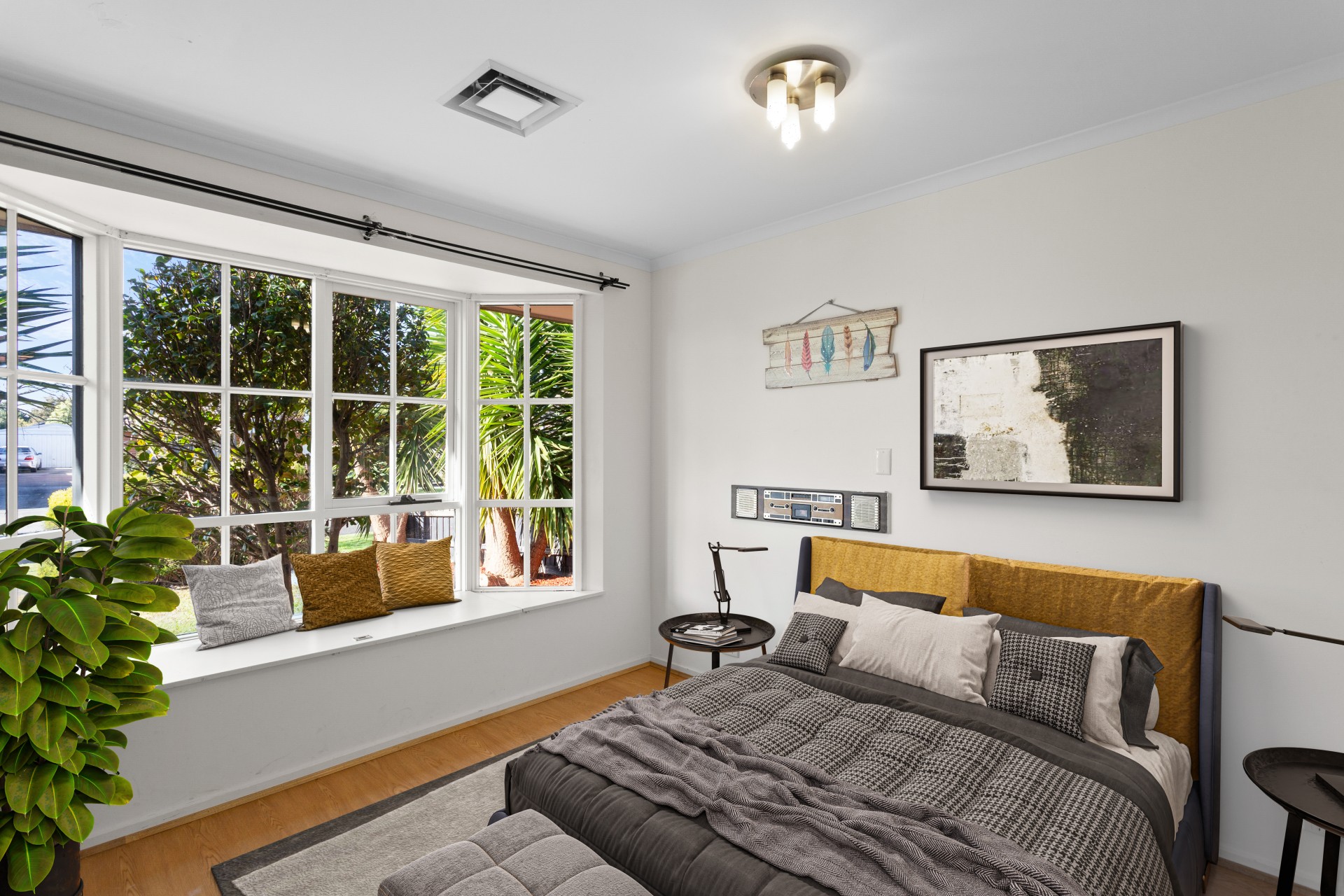 One bedroom features a charming bay window adding light and character