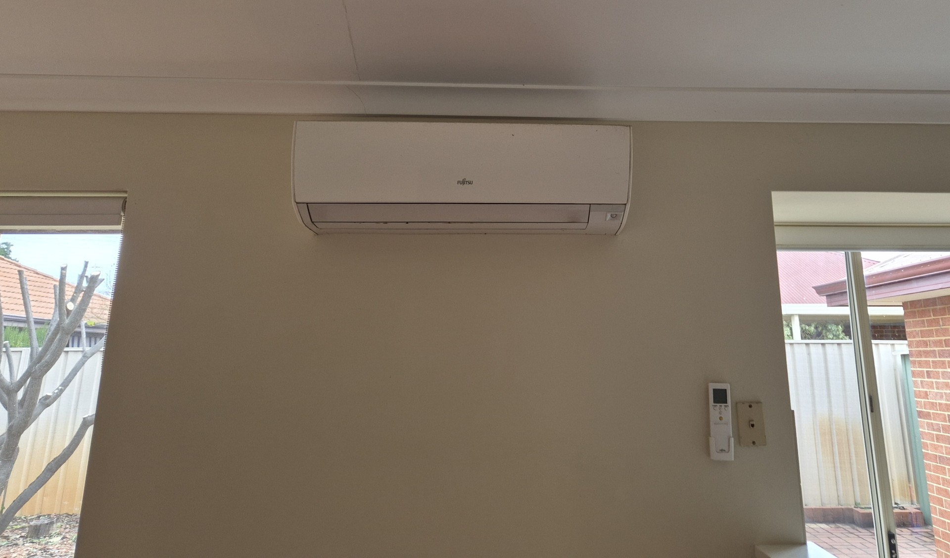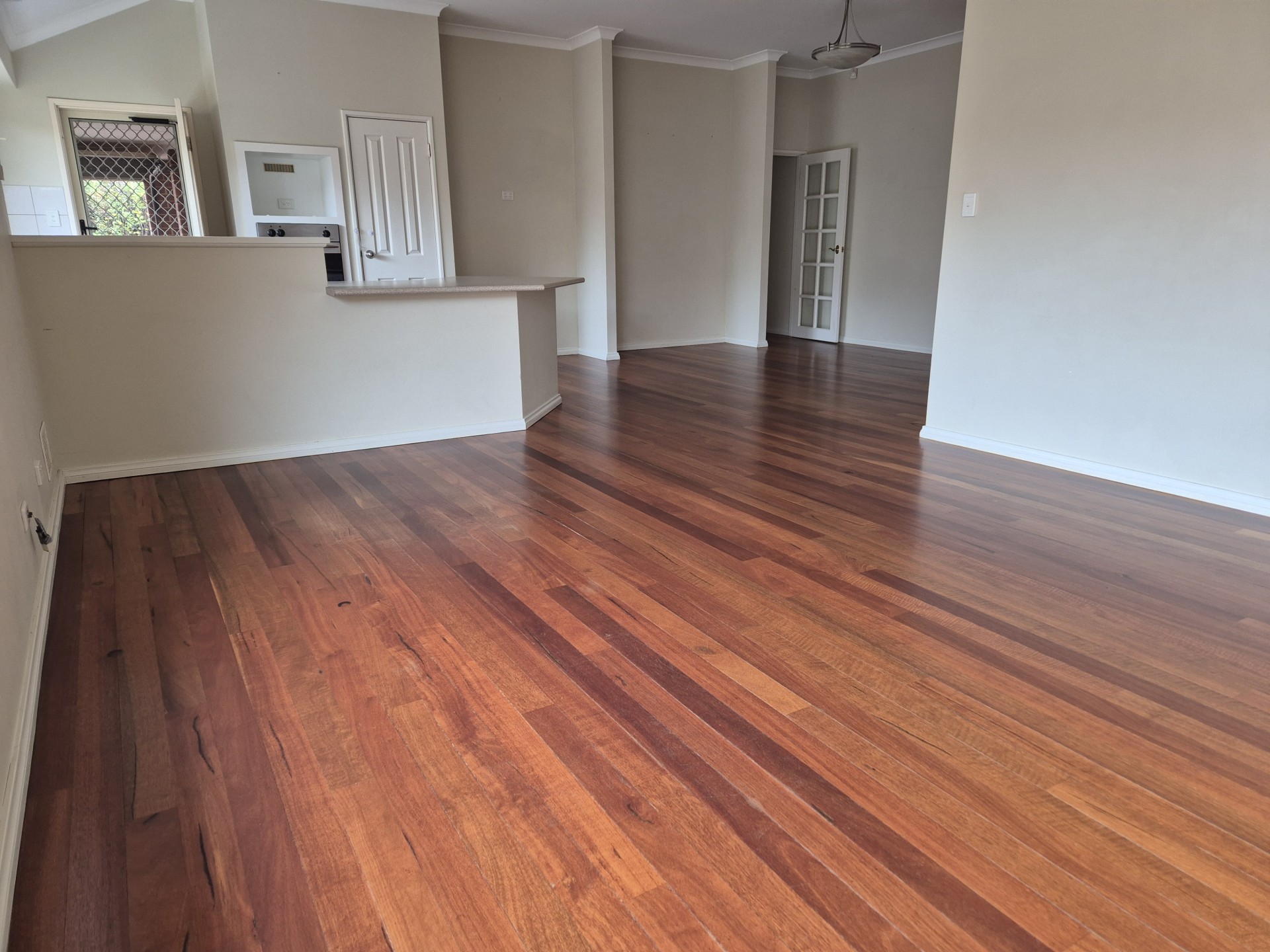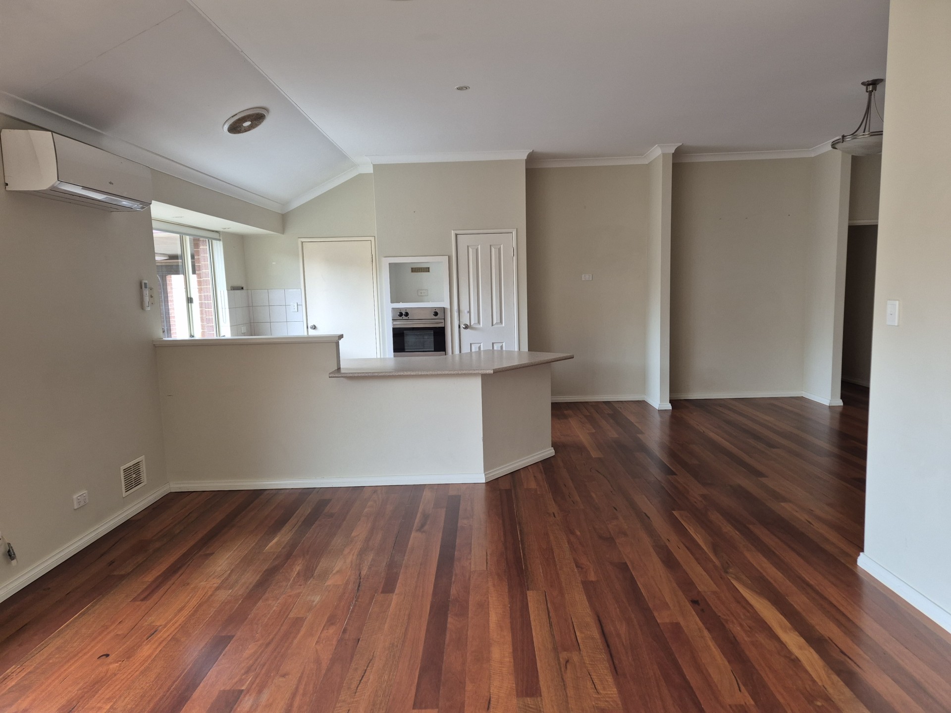 Living, kitchen and dining area has high ceilings, jarrah floors and reverse cycle air-conditioning.